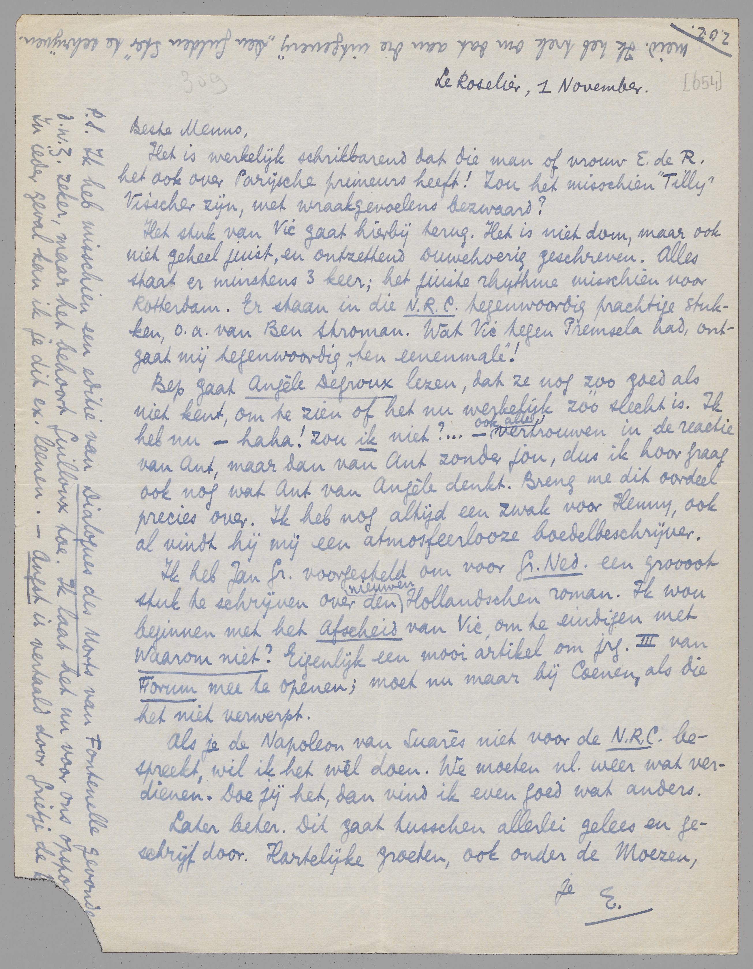 Ik heb Jan Gr. voorgesteld om voor Gr. Ned. een groooot stuk te schrijven over den nieuwen Hollandschen roman. Ik wou beginnen met het Afscheid van Vic, om te eindigen met Waarom niet? Eigenlijk een mooi artikel om jrg. III van Forum mee te openen; moet nu maar bij Coenen, als die het niet verwerpt.