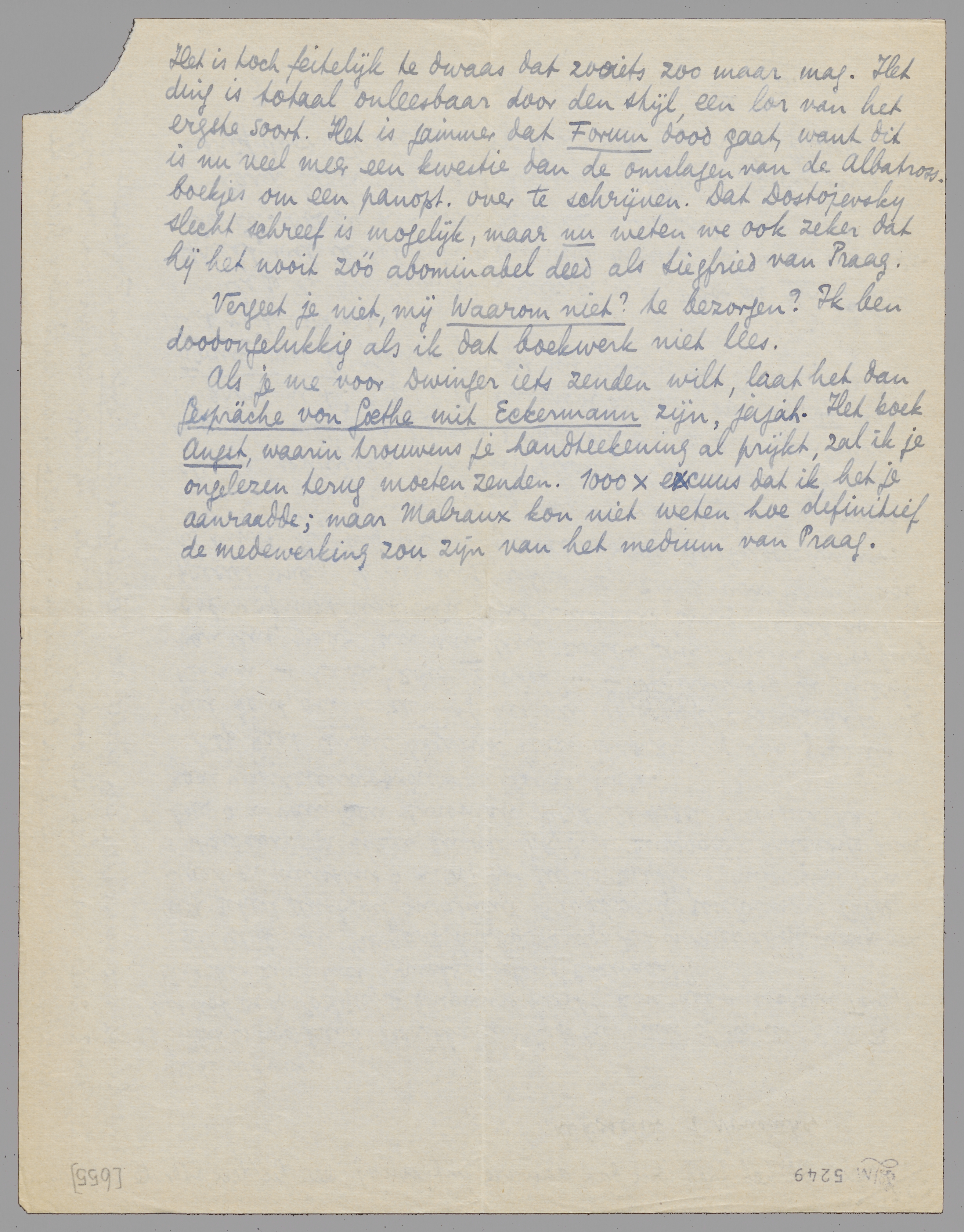 Als je me voor Dwinger iets zenden wilt, laat het dan Gespräche von Goethe mit Eckermann zijn, jajah. Het boek Angst, waarin trouwens je handteekening al prijkt, zal ik je ongelezen terug moeten zenden. 1000 × excuus dat ik het je aanraadde; maar Malraux kon niet weten hoe definitief de medewerking zou zijn van het medium van Praag.