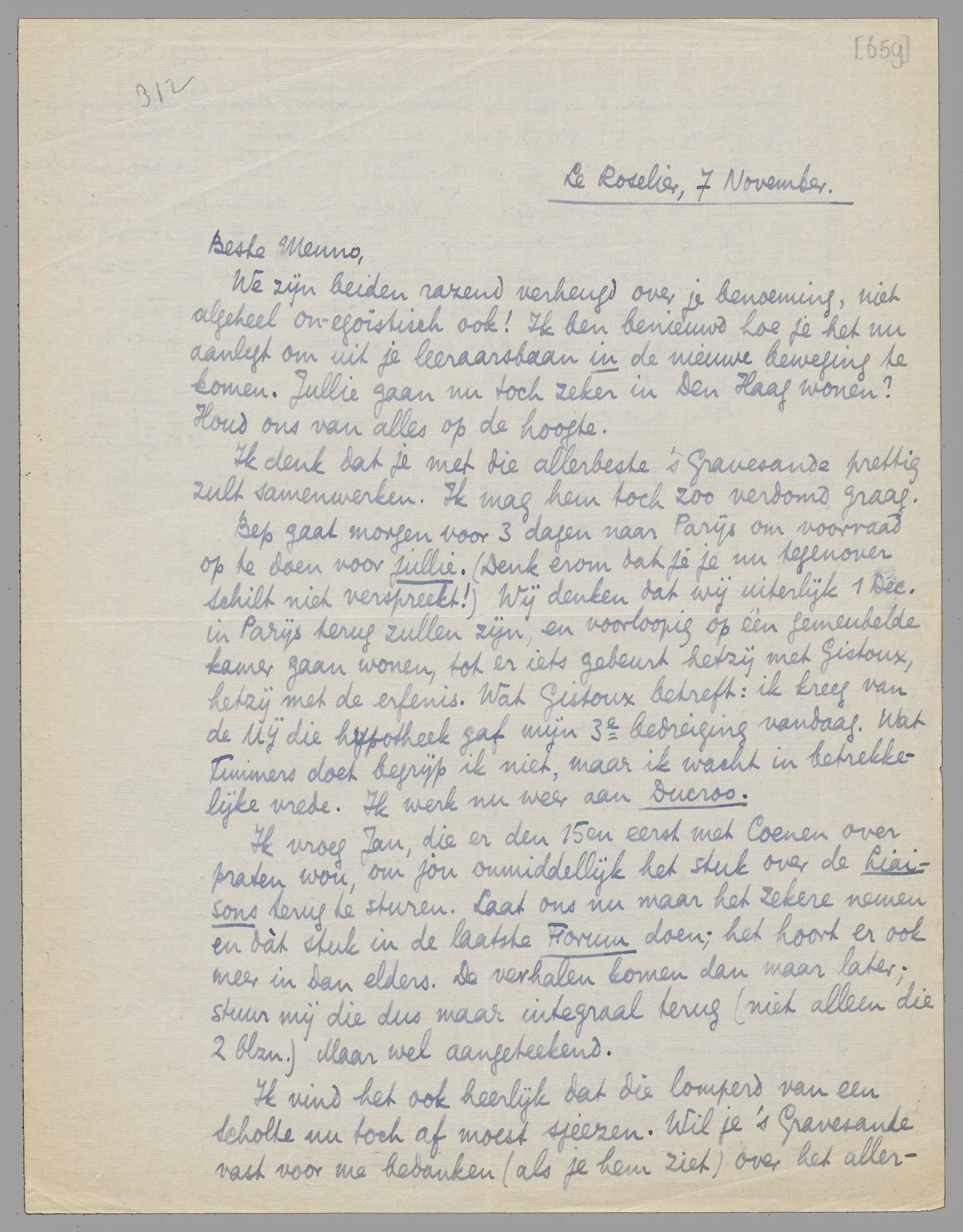 Zouden wij voor December weer het Forum-honorarium een weekje vooruit kunnen krijgen, als het aantal paginas bekend is? Behalve mijn maandgeld van thuis, komt er nooit iets precies op de 1e binnen, en de eerste moet altijd de school van Gille betaald worden, en dit keer een hotelrekening. Dag! veel liefs voor jullie beiden, B.