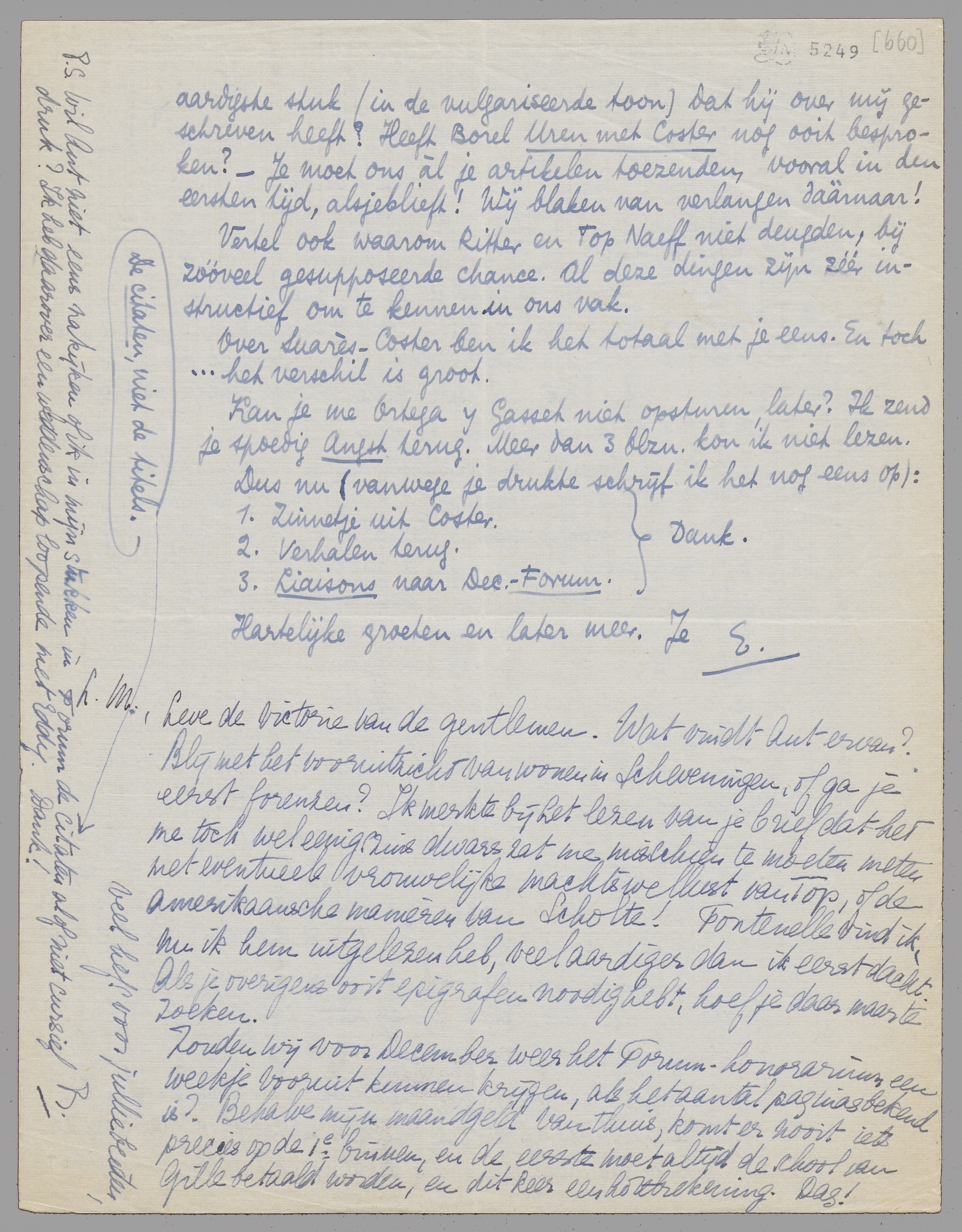 Ik vroeg Jan, die er den 15en eerst met Coenen over praten wou, om jou onmiddellijk het stuk over de Liaisons terug te sturen. Laat ons nu maar het zekere nemen en dàt stuk in de laatste Forum doen; het hoort er ook meer in dan elders. De verhalen komen dan maar later; stuur mij die dus maar integraal terug (niet alleen die 2 blzn.) Maar wel aangeteekend.