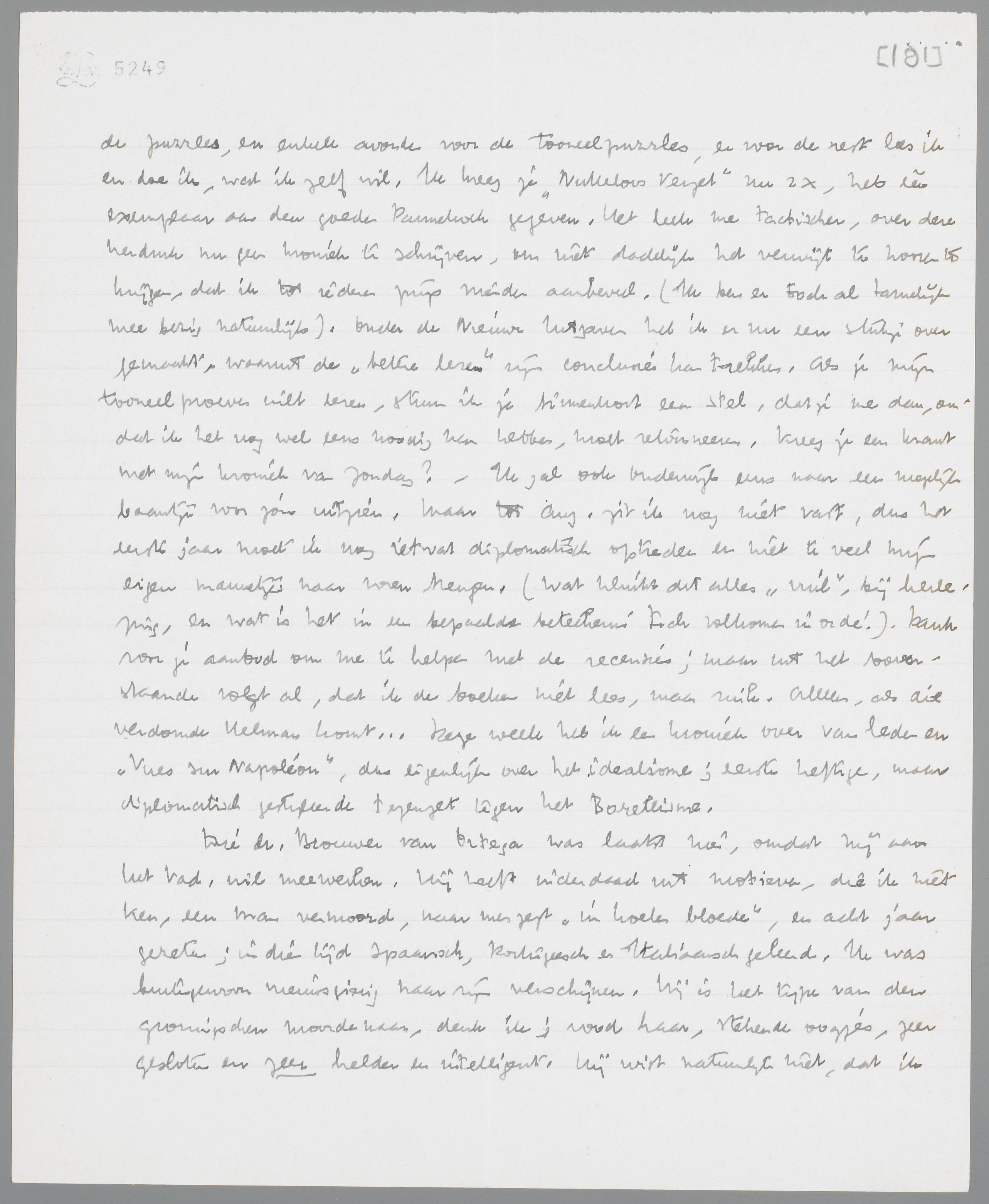 Eindelijk kan ik er dan eens even ‘uitbreken’, om je te schrijven. Ik heb deze week letterlijk geen oogenblik vrij gehad. School, artikeltjes maken, kroniek schrijven, twee tooneelpremières: het is werkelijk welletjes en de troost van twee salarissen is gering; ik heb er trouwens mijn belasting van betaald. Overigens blijkt, dat iemand, als hij van zins zou zijn zich kapot te werken en niets anders te doen, tegelijk leeraar en Borel zou kunnen zijn! Maar ik zal de hemel danken, als ik eindelijk mijn ontslag beet heb; dan zal, gegeven dat ik met de heeren van de krant op kan schieten, het werk aan de rubriek alleen wel meevallen. Ik lees die boeken van de Schartens c.s. eenvoudig niet; ik ruik ze, snoep even van de inhoud en maak er een stukje woorden over. De cabotins van het tooneel heb ik zonder eenige innerlijke emotie gevolgd en beschreven, blijkbaar echter nog niet enthousiast genoeg, want Pannekoek schrijft mij, dat ik ook iets over het applaus en de bloemen moet vertellen. Dat gaat er de volgende maal dus ook nog bij. Het waren prima duitsche acteurs ditmaal (Bassermann, Moissi, Deutsch, Durieux) en voor mij was de ontmoeting dus zeer interessant, nadat ik in geen jaren tooneel had gezien en er alleen maar over had gedacht. Resultaat: ik volg het als een puzzle, een goed of slecht geconstrueerde, maar een puzzle. Met mijn werkelijke probleemen heeft noch dit, noch het boekjes lezen iets te maken; het gaat me allemaal vrij vlot af, alleen mist het product van die werkzaamheden de geestelijke verhevenheid en den dazen toon van Borel. Als ik nu van de school los ben, neem ik gewoon mijn morgen voor de puzzles, en enkele avonden voor de tooneelpuzzles, en voor de rest lees ik en doe ik, wat ik zelf wil. Ik kreeg je Nutteloos Verzet nu 2 ×, heb één exemplaar aan den goeden Pannekoek gegeven. Het leek me tactischer, over deze herdruk nu geen kroniek te schrijven, om niet dadelijk het verwijt te hooren te krijgen, dat ik tot iederen prijs vrienden aanbeveel. (Ik ben er toch al tamelijk mee bezig natuurlijk). Onder de Nieuwe Uitgaven heb ik er nu een stukje over gemaakt, waaruit de ‘betere lezer’ zijn conclusie kan trekken. Als je mijn toneelproeven wilt lezen, stuur ik je binnenkort een stel, dat je me dan, omdat ik het nog wel eens noodig kan hebben, moet retourneeren. Kreeg je een krant met mijn kroniek van Zondag? - Ik zal ook onderwijl eens naar een mogelijk baantje voor jou uitzien. Maar tot Aug. zit ik nog niet vast, dus het eerste jaar moet ik nog ietwat diplomatisch optreden en niet te veel mijn eigen mannetjes naar voren brengen. (Wat klinkt dit alles ‘vuil’, bij herlezing, en wat is het in een bepaalde beteekenis toch volkomen in orde!). Dank voor je aanbod om me te helpen met de recensies; maar uit het bovenstaande volgt al, dat ik de boeken niet lees, maar ruik. Alleen, als die verdomde Helman komt... Deze week heb ik een kroniek over van Eeden en Vues sur Napoléon, dus eigenlijk over het idealisme; eerste heftige, maar diplomatisch gestyleerde tegenzet tegen het Borelisme.