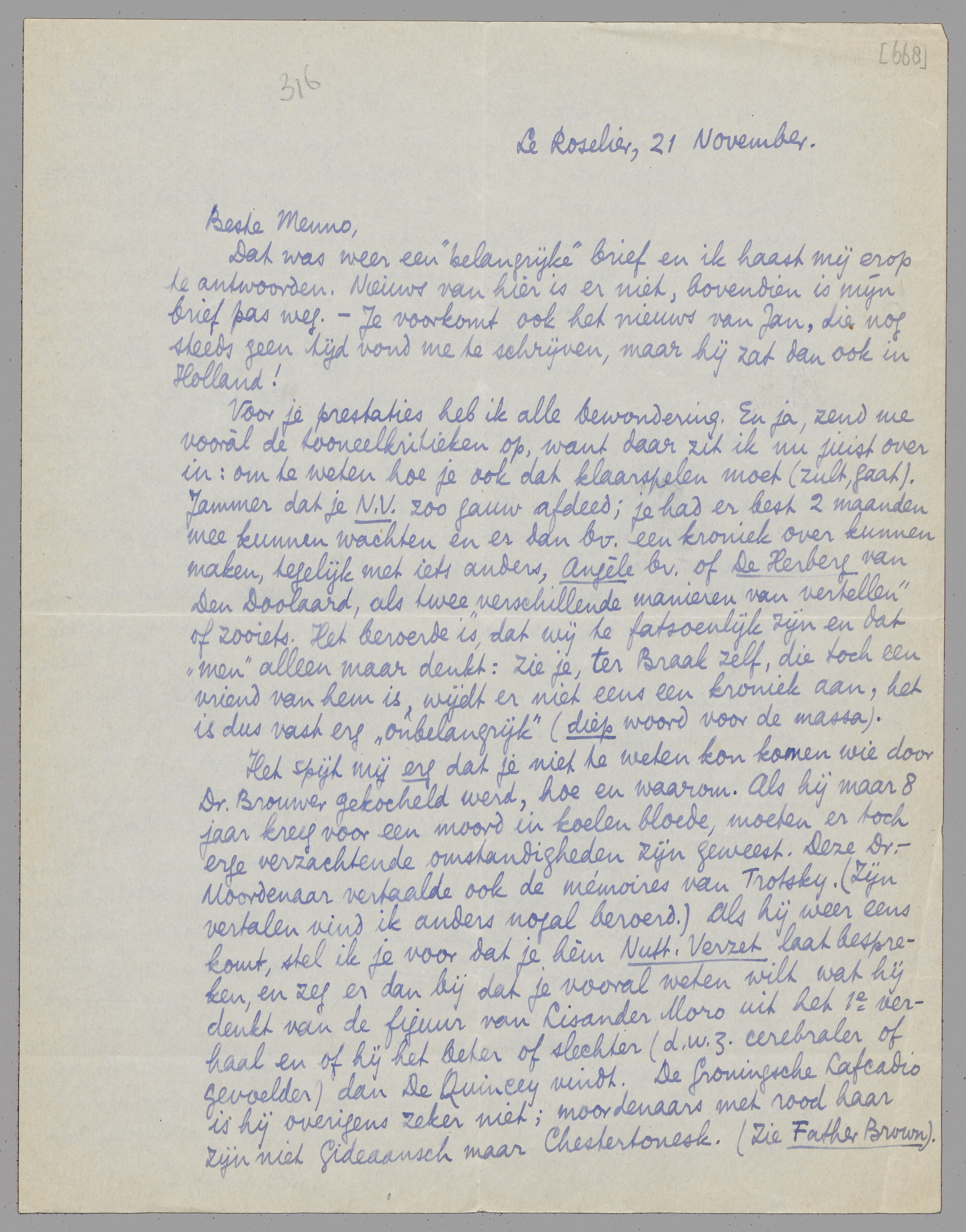 Het spijt mij erg dat je niet te weten kon komen wie door Dr. Brouwer gekocheld werd, hoe en waarom. Als hij maar 8 jaar kreeg voor een moord in koelen bloede, moeten er toch erge verzachtende omstandigheden zijn geweest. Deze Dr.- Moordenaar vertaalde ook de mémoires van Trotsky. (Zijn vertalen vind ik anders nogal beroerd.) Als hij weer eens komt, stel ik je voor dat je hèm Nutt. Verzet laat bespreken, en zeg er dan bij dat je vooral weten wilt wat hij denkt van de figuur van Lisander Moro uit het 1e verhaal en of hij het beter of slechter (d.w.z. cerebraler of gevoelder) dan De Quincey vindt. De Groningsche Lafcadio is hij overigens zeker niet; moordenaars met rood haar zijn niet Gideaansch maar Chestertonesk. (Zie Father Brown).