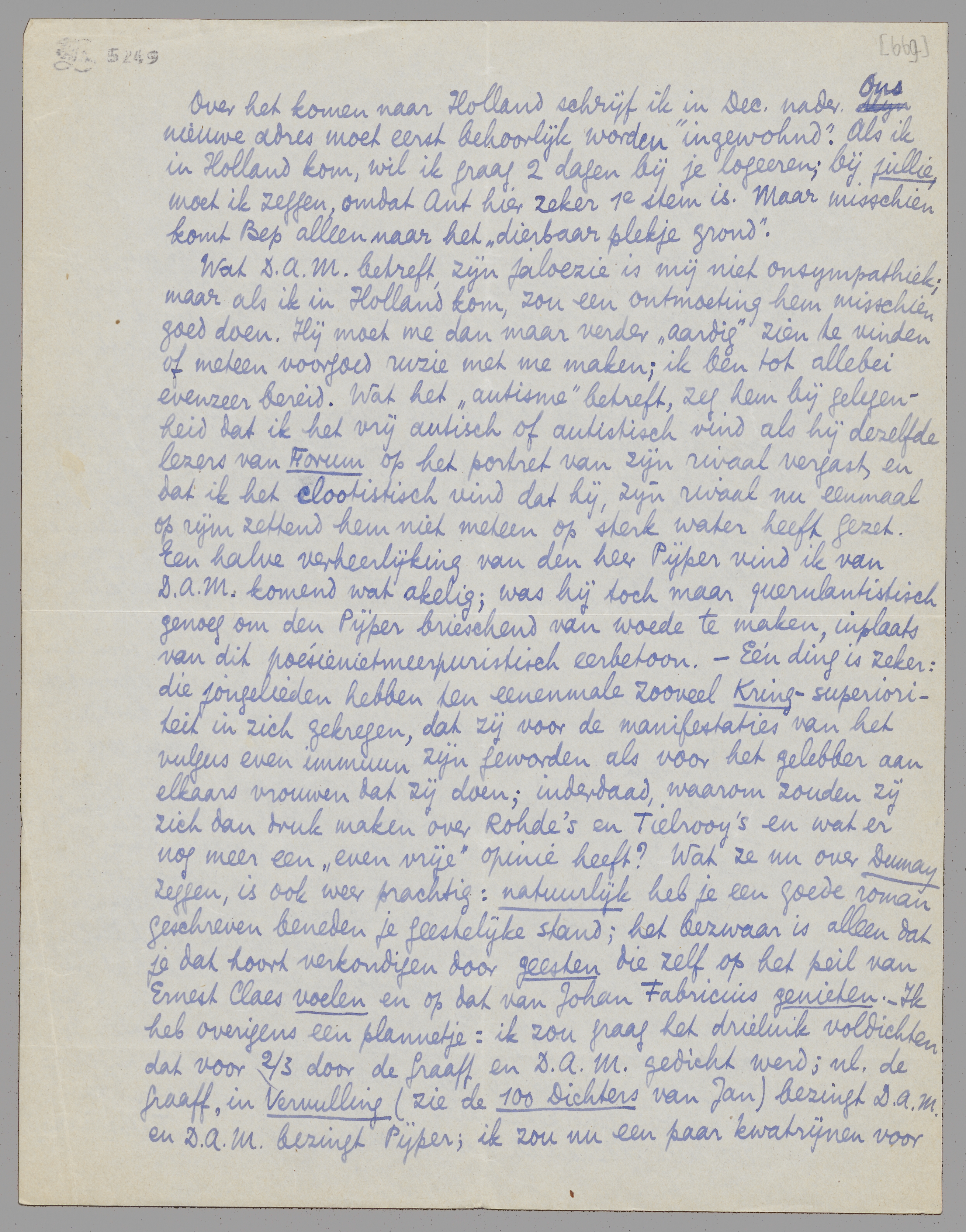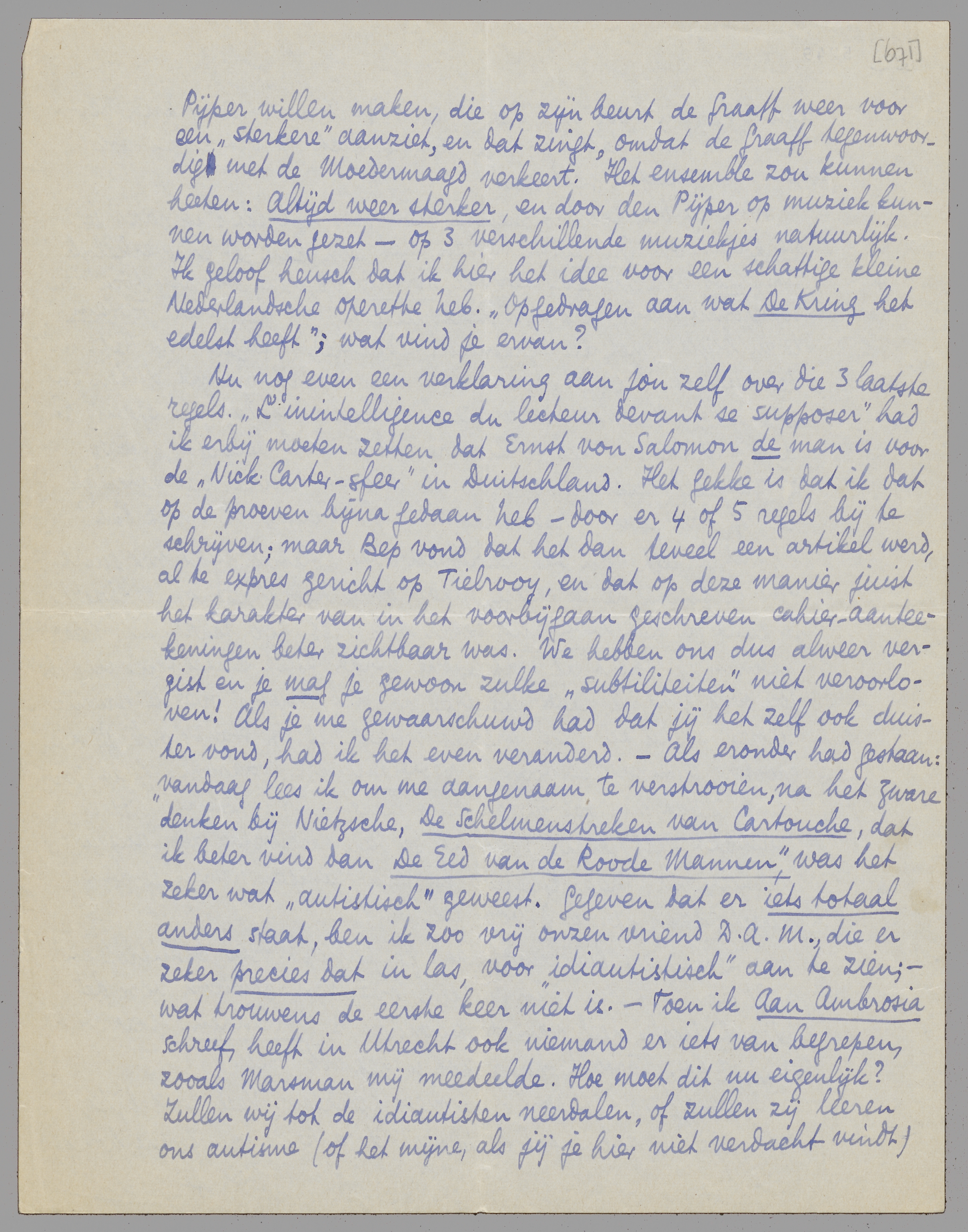 Nu nog even een verklaring aan jou zelf over die 3 laatste regels. ‘L'inintelligence du lecteur devant se supposer’ had ik erbij moeten zetten dat Ernst von Salomon de man is voor de ‘Nick Carter-sfeer’ in Duitschland. Het gekke is dat ik dat op de proeven bijna gedaan heb - door er 4 of 5 regels bij te schrijven; maar Bep vond dat het dan teveel een artikel werd, al te expres gericht op Tielrooy, en dat op deze manier juist het karakter van in het voorbijgaan geschreven cahier-aanteekeningen beter zichtbaar was. We hebben ons dus alweer vergist en je mag je gewoon zulke ‘subtiliteiten’ niet veroorloven! Als je me gewaarschuwd had dat jij het zelf ook duister vond, had ik het even veranderd. - Als eronder had gestaan: vandaag lees ik om me aangenaam te verstrooien, na het zware denken bij Nietzsche, De Schelmenstreken van Cartouche, dat ik beter vind dan De Eed van de Roode Mannen, was het zeker wat ‘autistisch’ geweest. Gegeven dat er iets totaal anders staat, ben ik zoo vrij onzen vriend D.A.M., die er zeker precies dat in las, voor ‘idiautistisch’ aan te zien; - wat trouwens de eerste keer niet is. - Toen ik Aan Ambrosia schreef, heeft in Utrecht ook niemand er iets van begrepen, zooals Marsman mij meedeelde. Hoe moet dit nu eigenlijk? Zullen wij tot de idiautisten neerdalen, of zullen zij leeren ons autisme (of het mijne, als jij je hier niet verdacht vindt) aan te hooren voor wat het is, en niet voor wat zij erin verstaan? Ik vind dat die ‘vrije geesten’ zich op dit gebied ook maar wat moeten oefenen.