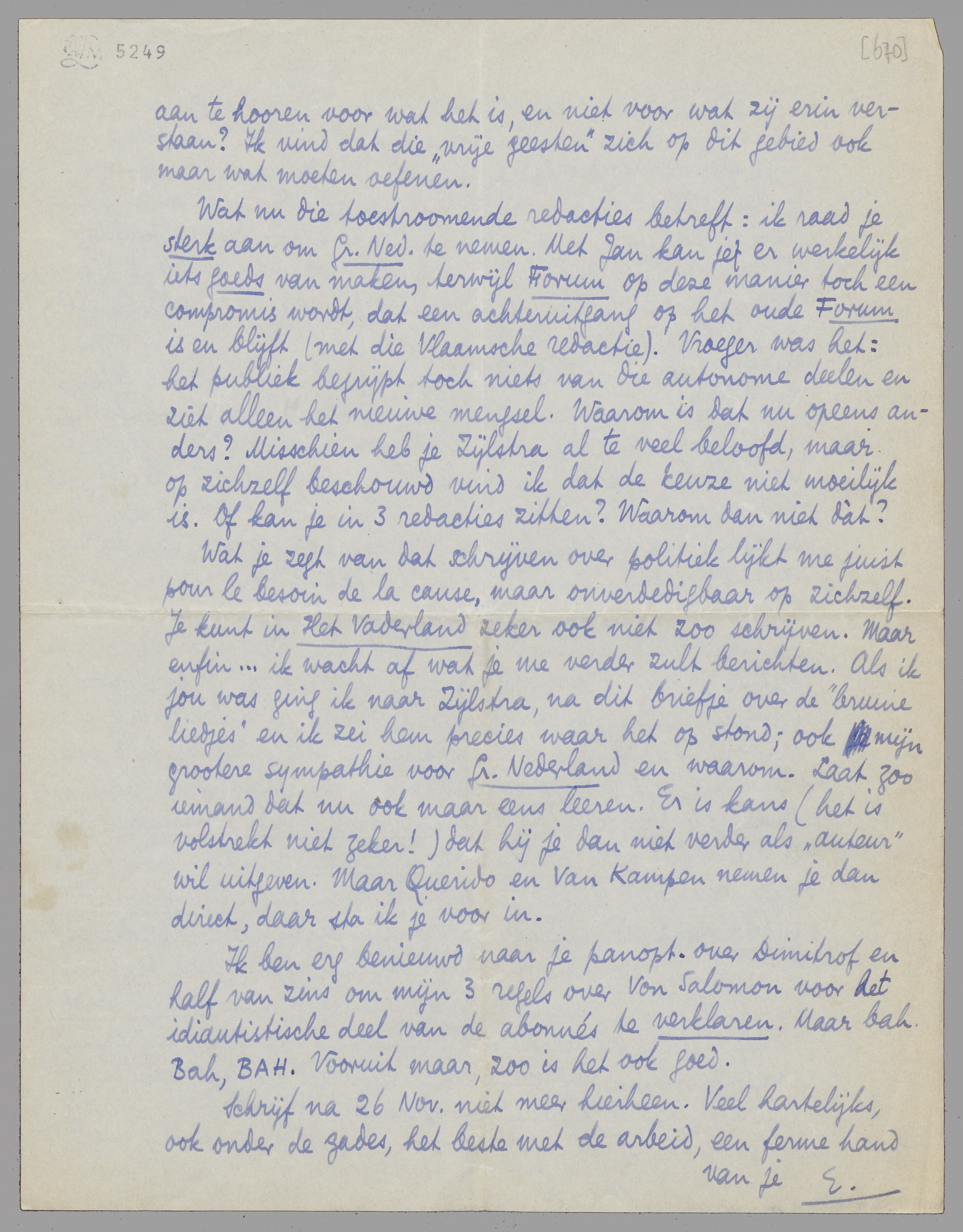 Wat nu die toestroomende redacties betreft: ik raad je sterk aan om Gr. Ned. te nemen. Met Jan kan je er werkelijk iets goeds van maken, terwijl Forum op deze manier toch een compromis wordt, dat een achteruitgang op het oude Forum is en blijft (met die Vlaamsche redactie). Vroeger was het: het publiek begrijpt toch niets van die autonome deelen en ziet alleen het nieuwe mengsel. Waarom is dat nu opeens anders? Misschien heb je Zijlstra al te veel beloofd, maar op zichzelf beschouwd vind ik dat de keuze niet moeilijk is. Of kan je in 3 redacties zitten? Waarom dan niet dàt?