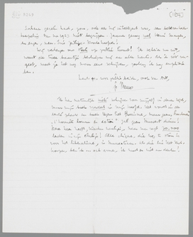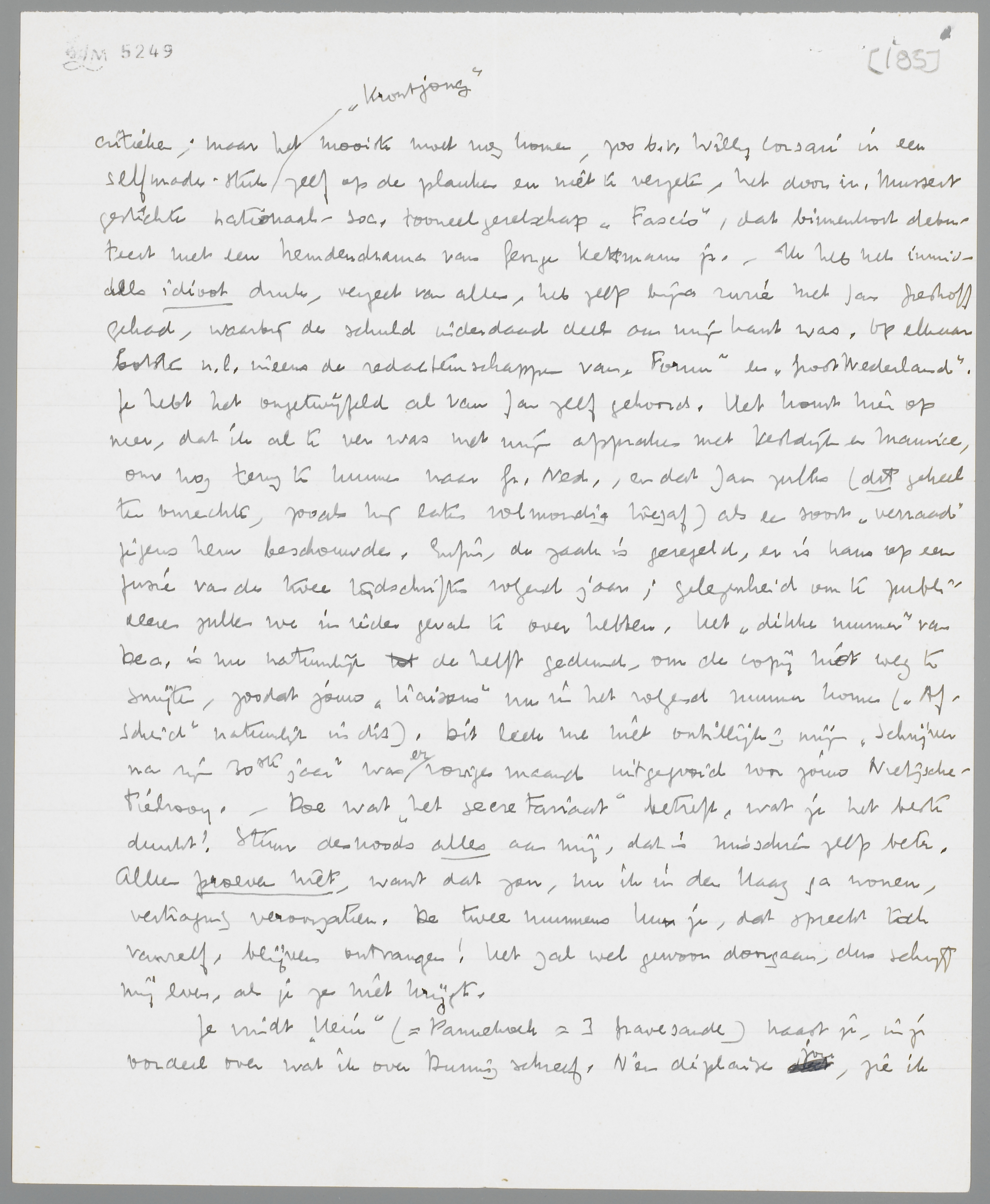 Je vindt ‘Hein’ (= Pannekoek = 's Gravesande) naast je, in je oordeel over wat ik over Buning schreef. N'en déplaise jou, zie ik nog niet, waarom ik hem onbillijk beoordeeld heb! Maar jij hebt nu eenmaal nog een zwak voor de poëzie in dien ‘toon’, dat ik ontbeer. - Over Nutteloos Verzet heb ik zelf later spijt gehad; ik was inderdaad te fatsoenlijk. Maar wacht nu op Ducroo!! Dan heb ik de ongezochtste gelegenheid en twee geweldige kolommen, om je te presenteeren!