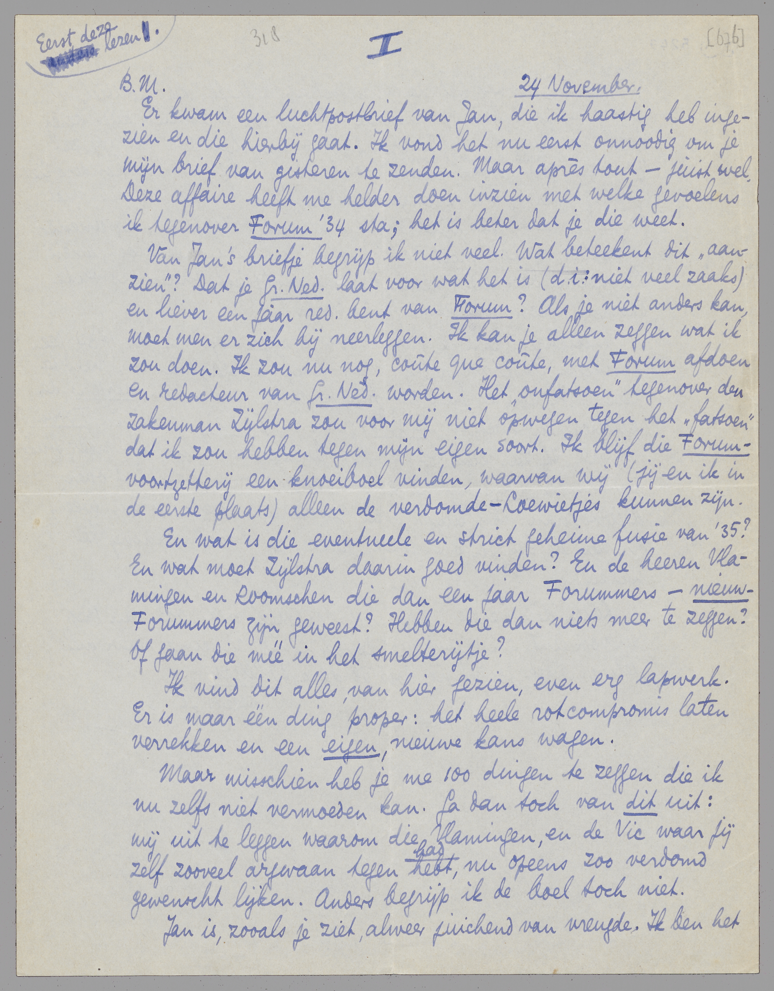 Er kwam een luchtpostbrief van Jan, die ik haastig heb ingezien en die hierbij gaat. Ik vond het nu eerst onnoodig om je mijn brief van gisteren te zenden. Maar après tout - juist wel. Deze affaire heeft me helder doen inzien met welke gevoelens ik tegenover Forum '34 sta; het is beter dat je die weet.