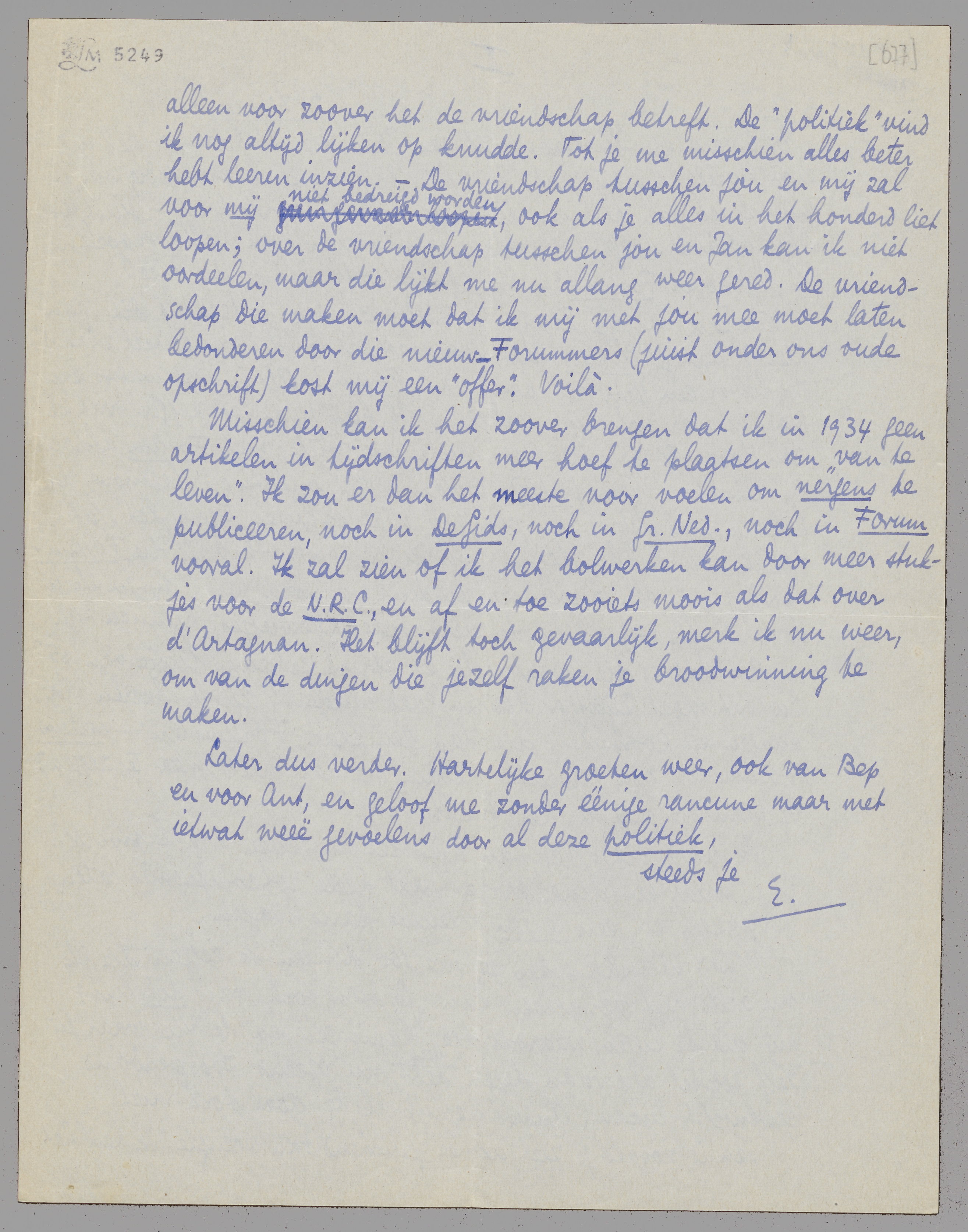Ik heb voor het nieuwe Forum niet de minste sympathie. Het eenige wat mij erin houdt is nu de vriendschap voor jou. Met Bouws die er nu in blijft en met die Vlamingen die er eigenlijk alleen in konden komen als ik eruit ging, is het een tijdschrift als een ander voor mij, een plaats waar ik eigenlijk niet thuishoor. Waar dit tijdschrift voortgaat onder onze oude naam, voel ik mij eigenlijk gedupeerd. En jou erbij; maar jij schijnt ergens gevoelens of een geloof te hebben behouden dat ik nu, na deze verknoeide Gr. Ned.-affaire, totaal verloren heb. Meewerken aan Forum beteekent voor mij publicatiemogelijkheid + dubbeltjes - maar ik hoop dat ik daar tenslotte niet op letten zal! - en daarboven: mij mee laten overstroomen door al deze z.g. vrienden, uit vriendschap voor jou. Zonder vriendschapsverhouding met jou zou mijn houding nu klaar zijn: vanaf 1 Jan. bestaat Forum voor mij niet meer en als ik lust zou hebben, zou ik het bestrijden, onverschillig waar. Vind je dat je mijn medewerking onder deze omstandigheden (en ik overdrijf niets), kunt aanvaarden, dan zal ik je mijn bijdragen sturen, als aan ieder ander tijdschrift dat mij ‘graag wel eens plaatsen wil’, De Gids of zoo. Vind je dat onze vrienschap tegen dit stootje bestand is, dan had ik het liefst dat je mij met 1 Jan. als medewerker afschreef. Tenslotte zijn er toch gevoelsoverwegingen die méér tellen dan publicatiemogelijkheid. Als jij niet meer terug kan, ik misschien nog wel?*
