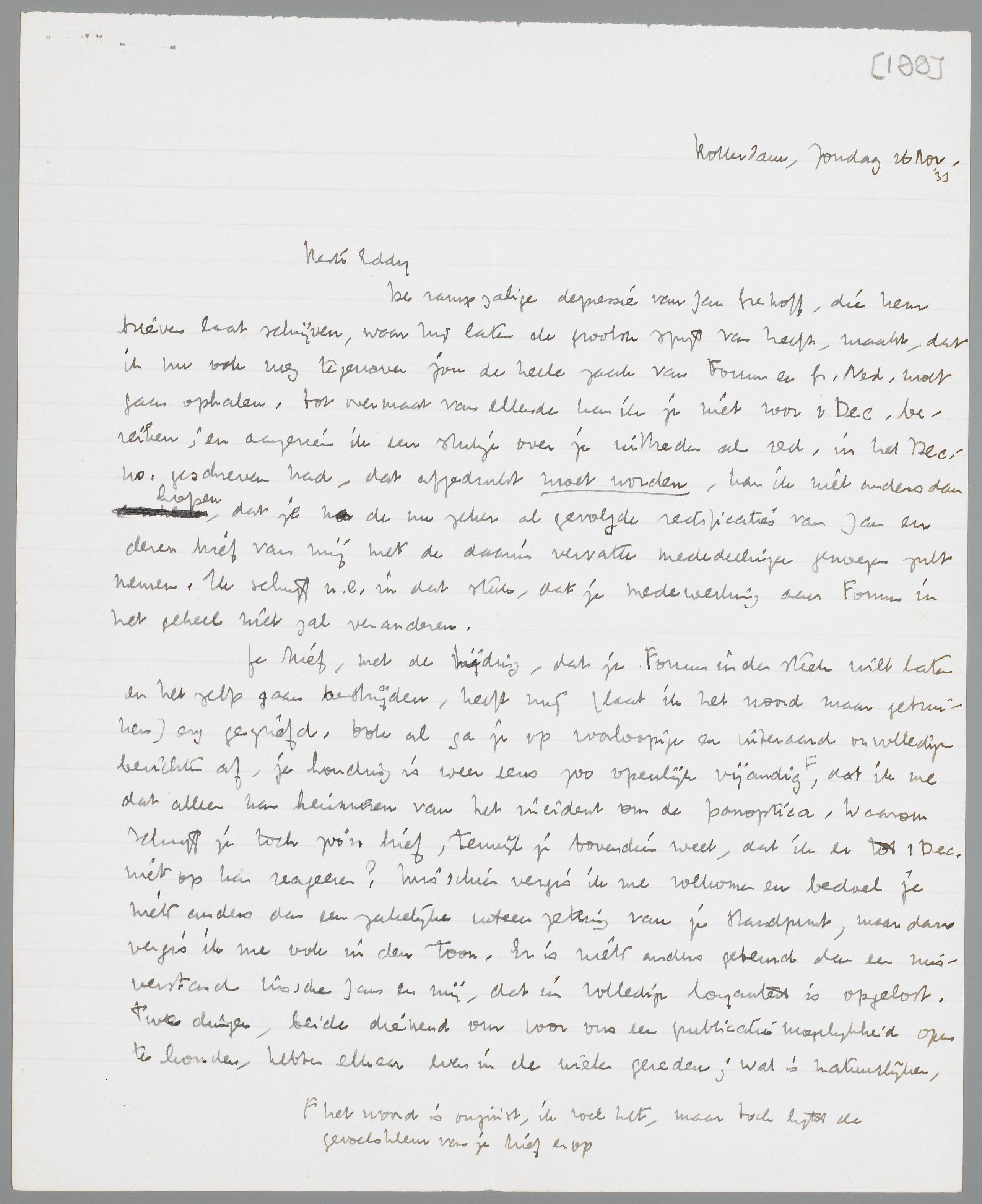 De rampzalige depressie van Jan Greshoff, die hem brieven laat schrijven, waar hij later de grootste spijt van heeft, maakt, dat ik nu ook nog tegenover jou de heele zaak van Forum en Gr. Ned. moet gaan ophalen. Tot overmaat van ellende kan ik je niet voor 2 Dec. bereiken; en aangezien ik een stukje over je uittreden als red. in het Dec.-no. geschreven had, dat afgedrukt moet worden, kan ik niet anders dan hopen, dat je na de nu zeker al gevolgde rectificaties van Jan en dezen brief van mij met de daarin vervatte mededeelingen genoegen zult nemen. Ik schrijf n.l. in dat stuk, dat je medewerking aan Forum in het geheel niet zal veranderen.