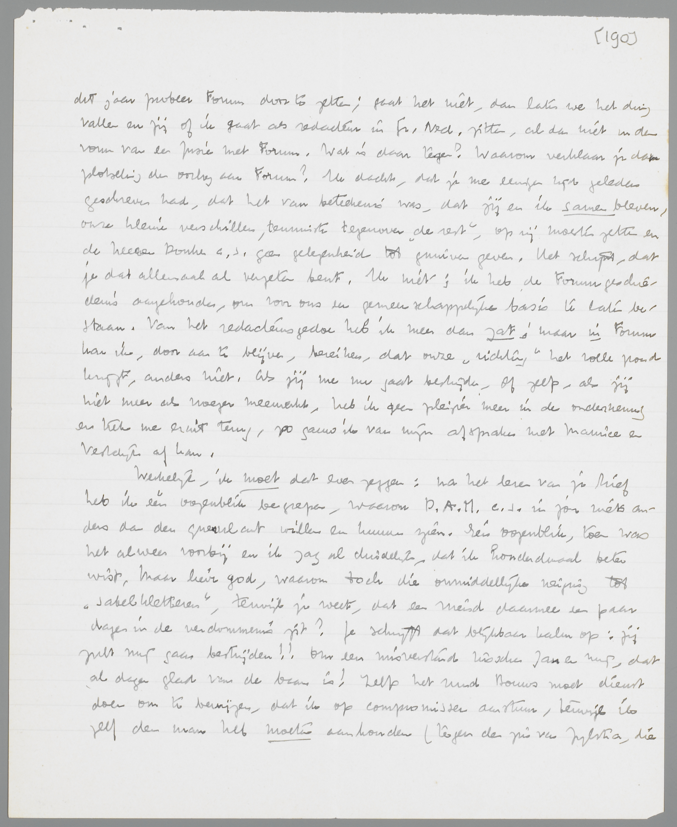 Voor mij vervalt er iets absoluut essentieels, als je Forum in den steek laat; niet mijn vriendschap voor je natuurlijk, maar toch iets. Zooiets van: dat heeft hij gemakkelijk kunnen doen, daar uit de verte, hij laat mij in het verrotte Holland de rommel opknappen. Misschien al weer ontzettend onrechtvaardig van me, want het is best mogelijk, dat jouw houding ‘zuiverder’ is dan de mijne. Ik heb, inderdaad, in laatste instantie en na afschrijving van de onmogelijke eischen van Maurice, die samenwerking met de Vlamingen geaccepteerd. Ik meen, dat ik niet veel anders kon doen, maar ik kan me daarin vergissen. Alleen: ik heb je x maal gezegd, dat mijn pleizier in Forum staat of valt met jouw medewerking. Daar blijf ik bij.