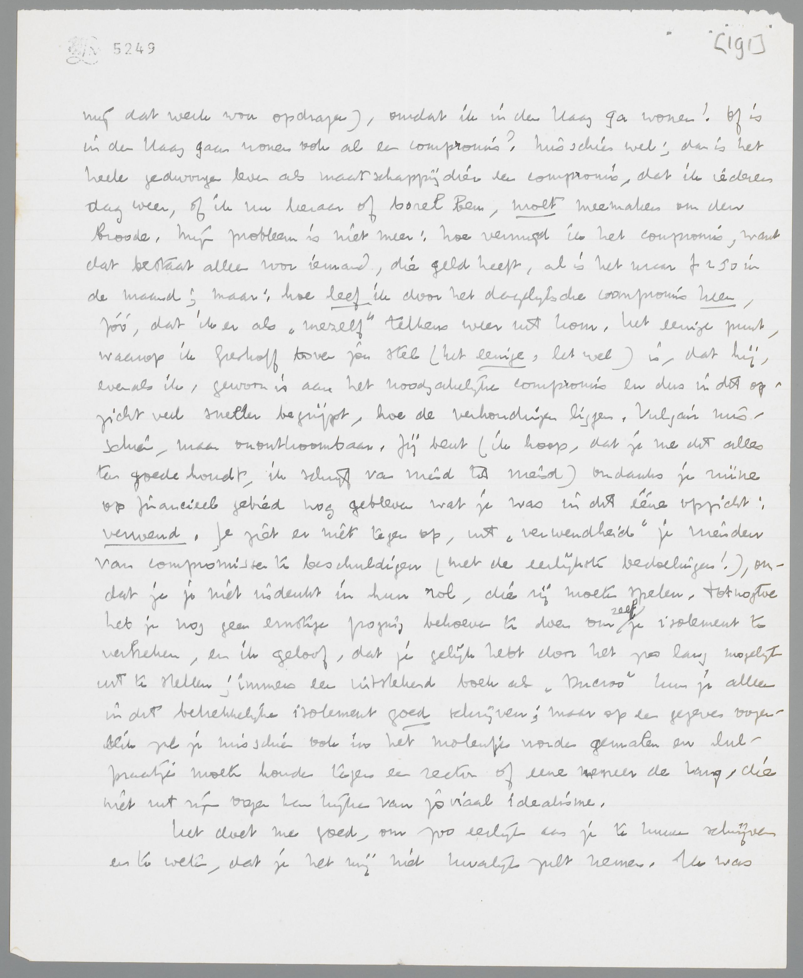 Werkelijk; ik moet dat even zeggen: na het lezen van je brief heb ik één oogenblik begrepen, waarom D.A.M. c.s. in jou niets anders dan den querulant willen en kunnen zien. Eén oogenblik, toen was het alweer voorbij en ik zag al duidelijk, dat ik honderdmaal beter wist. Maar lieve god, waarom toch die onmiddellijke neiging tot ‘sabelkletteren’, terwijl je weet, dat een vriend daarmee een paar dagen in de verdommenis zit? Je schrijft dat blijkbaar kalm op: jij zult mij gaan bestrijden!! Om een misverstand tusschen Jan en mij, dat al dagen glad van de baan is! Zelfs het rund Bouws moet dienst doen om te bewijzen, dat ik op compromissen aanstuur, terwijl ik zelf den man heb moeten aanhouden (tegen de zin van Zijlstra, die mij dat werk wou opdragen), omdat ik in den Haag ga wonen! Of is in den Haag gaan wonen ook al een compromis? Misschien wel; dan is het heele gedwongen leven als maatschappijdier een compromis, dat ik iederen dag weer, of ik nu leeraar of borel ben, moet meemaken om den broode. Mijn probleem is niet meer: hoe vermijd ik het compromis, want dat bestaat alleen voor iemand, die geld heeft, al is het maar ƒ 250 in de maand; maar: hoe leef ik door het dagelijksche compromis heen, zóó, dat ik er als ‘mezelf’ telkens weer uit kom. Het eenige punt, waarop ik Greshoff boven jou stel (het eenige, let wel) is, dat hij evenals ik, gewoon is aan het noodzakelijke compromis en dus in dit opzicht veel sneller begrijpt, hoe de verhoudingen liggen. Vulgair misschien, maar onontkoombaar. Jij bent (ik hoop, dat je me dit alles ten goede houdt, ik schrijf van vriend tot vriend) ondanks je ruïne op financieel gebied nog gebleven wat je was in dit ééne opzicht: verwend. Je ziet er niet tegen op, uit ‘verwendheid’ je vrienden van compromissen te beschuldigen (met de eerlijkste bedoelingen!), omdat je je niet indenkt in hun rol, die zij moeten spelen. Totnogtoe heb je nog geen ernstige poging behoeven te doen om zelf je isolement te verbreken, en ik geloof, dat je gelijk hebt door het zoo lang mogelijk uit te stellen; immers een uitstekend boek als Ducroo kun je alleen in dit betrekkelijke isolement goed schrijven; maar op een gegeven oogenblik zul je misschien ook in het molentje worden gemalen en lulpraatjes moeten houden tegen een rector of eene meneer de Lang, die niet uit zijn oogen kan kijken van joviaal idealisme.