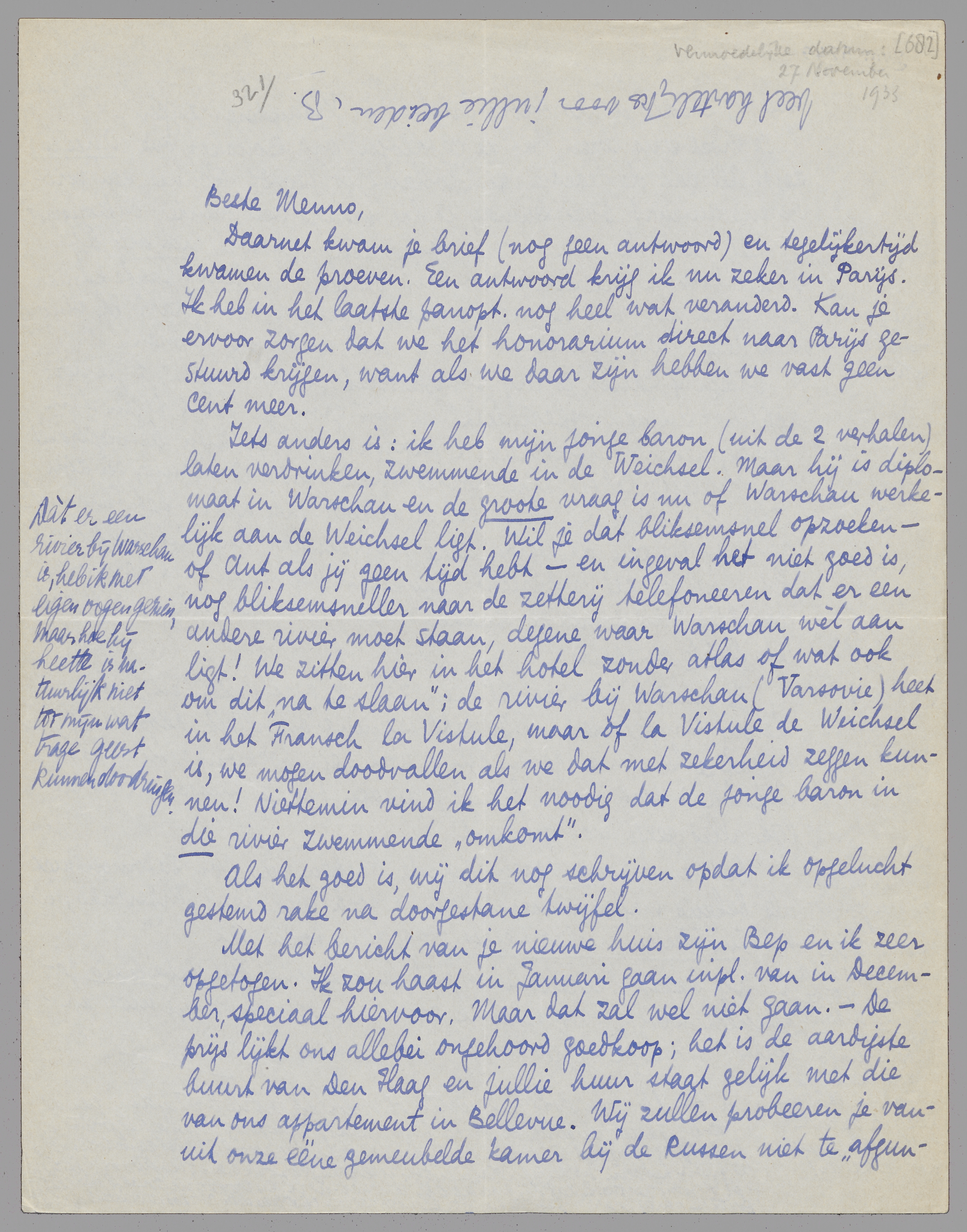 Iets anders is: ik heb mijn jonge baron (uit de 2 verhalen) laten verdrinken, zwemmende in de Weichsel. Maar hij is diplomaat in Warschau en de groote vraag is nu of Warschau werkelijk aan de Weichsel ligt. Wil je dat bliksemsnel opzoeken - of Ant als jij geen tijd hebt - en ingeval het niet goed is, nog bliksemsneller naar de zetterij telefoneeren dat er een andere rivier moet staan, degene waar Warschau wèl aan ligt! We zitten hier in het hotel zonder atlas of wat ook om dit ‘na te slaan’; de rivier bij Warschau (Varsovie) heet in het Fransch la Vistule, maar of la Vistule de Weichsel is, we mogen doodvallen als we dat met zekerheid zeggen kunnen! Niettemin vind ik het noodig dat de jonge baron in die rivier zwemmende ‘omkomt’. (Dàt er een rivier bij Warschau is, heb ik met eigen oogen gezien, maar hoe hij heette is natuurlijk niet tot mijn wat trage geest kunnen doordringen.)