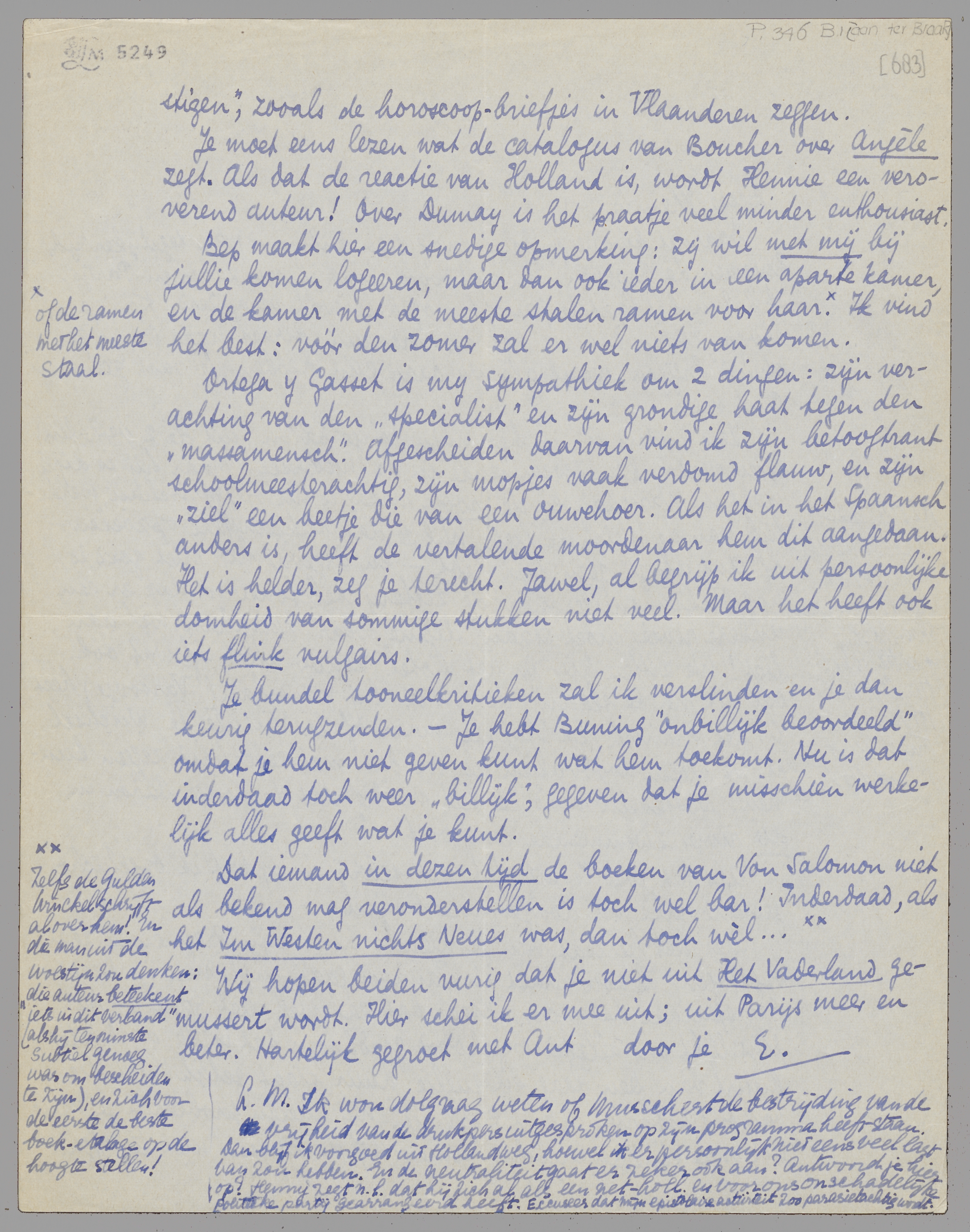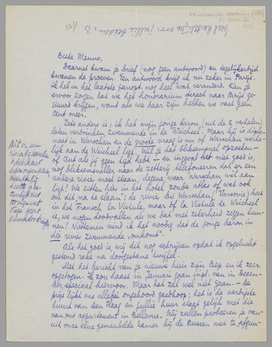[E.d.P.-d.R.:] L.M. Ik wou dolgraag weten of Musschert de bestrijding van de vrijheid van de drukpers uitgesproken op zijn programma heeft staan. Dan blijf ik voorgoed uit Holland weg, hoewel ik er persoonlijk niet eens zooveel last van zou hebben. En de neutraliteit gaat er zeker oók aan? Antwoord je hier op? Henny zegt n.l. dat hij zich al als een net-holl. en voor ons onschadelijke politieke partij gearrangeerd heeft. Excuseer dat mijn epistolaire activiteit zoo parasietachtig wordt.