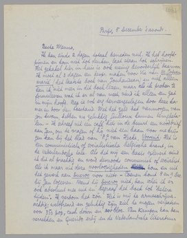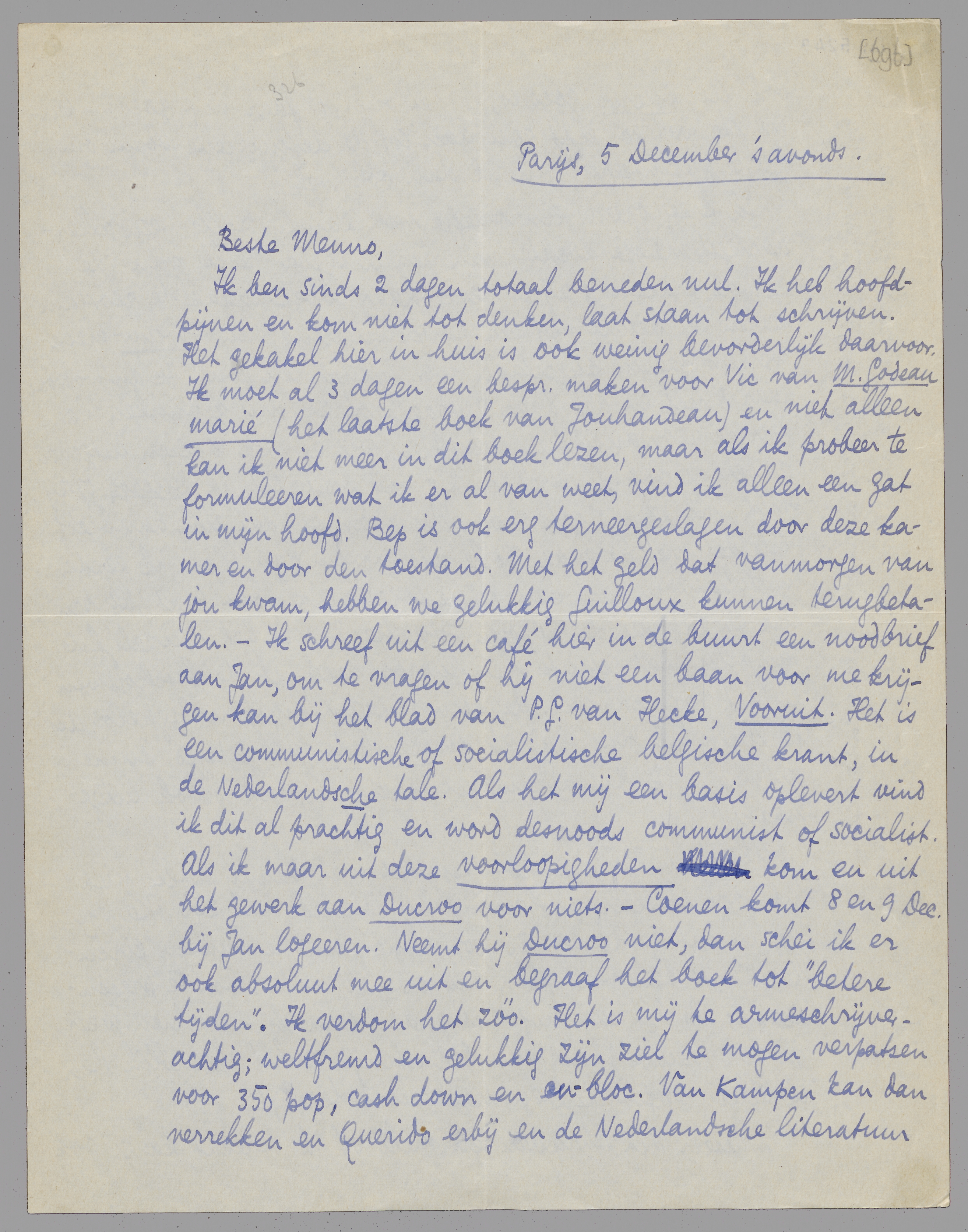 Ik ben sinds 2 dagen totaal beneden nul. Ik heb hoofdpijnen en kom niet tot denken, laat staan tot schrijven. Het gekakel hier in huis is ook weinig bevorderlijk daarvoor. Ik moet al 3 dagen een bespr. maken voor Vic van M. Godeau marié (het laatste boek van Jouhandeau) en niet alleen kan ik niet meer in dit boek lezen, maar als ik probeer te formuleeren wat ik er al van weet, vind ik alleen een gat in mijn hoofd. Bep is ook erg terneergeslagen door deze kamer en door den toestand. Met het geld dat vanmorgen van jou kwam, hebben we gelukkig Guilloux kunnen terugbetalen. - Ik schreef uit een café hier in de buurt een noodbrief aan Jan, om te vragen of hij niet een baan voor me krijgen kan bij het blad van P.G. van Hecke, Vooruit. Het is een communistische of socialistische belgische krant, in de Nederlandsche tale. Als het mij een basis oplevert vind ik dit al prachtig en word desnoods communist of socialist. Als ik maar uit deze voorloopigheden kom en uit het gewerk aan Ducroo voor niets. - Coenen komt 8 en 9 Dec. bij Jan logeeren. Neemt hij Ducroo niet, dan schei ik er ook absoluut mee uit en begraaf het boek tot ‘betere tijden’. Ik verdom het zóó. Het is mij te armeschrijverachtig; weltfremd en gelukkig zijn ziel te mogen verpatsen voor 350 pop, cash down en en-bloc. Van Kampen kan dan verrekken en Querido erbij en de Nederlandsche literatuur ook. Als Ducroo goed is, is het over 10 jaar nog goed; - tenminste wat er echt goed aan is; de definitieve vorm om het te ‘presenteeren’ vind ik dan ook wel.