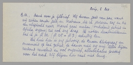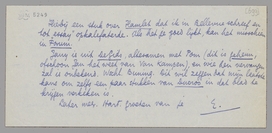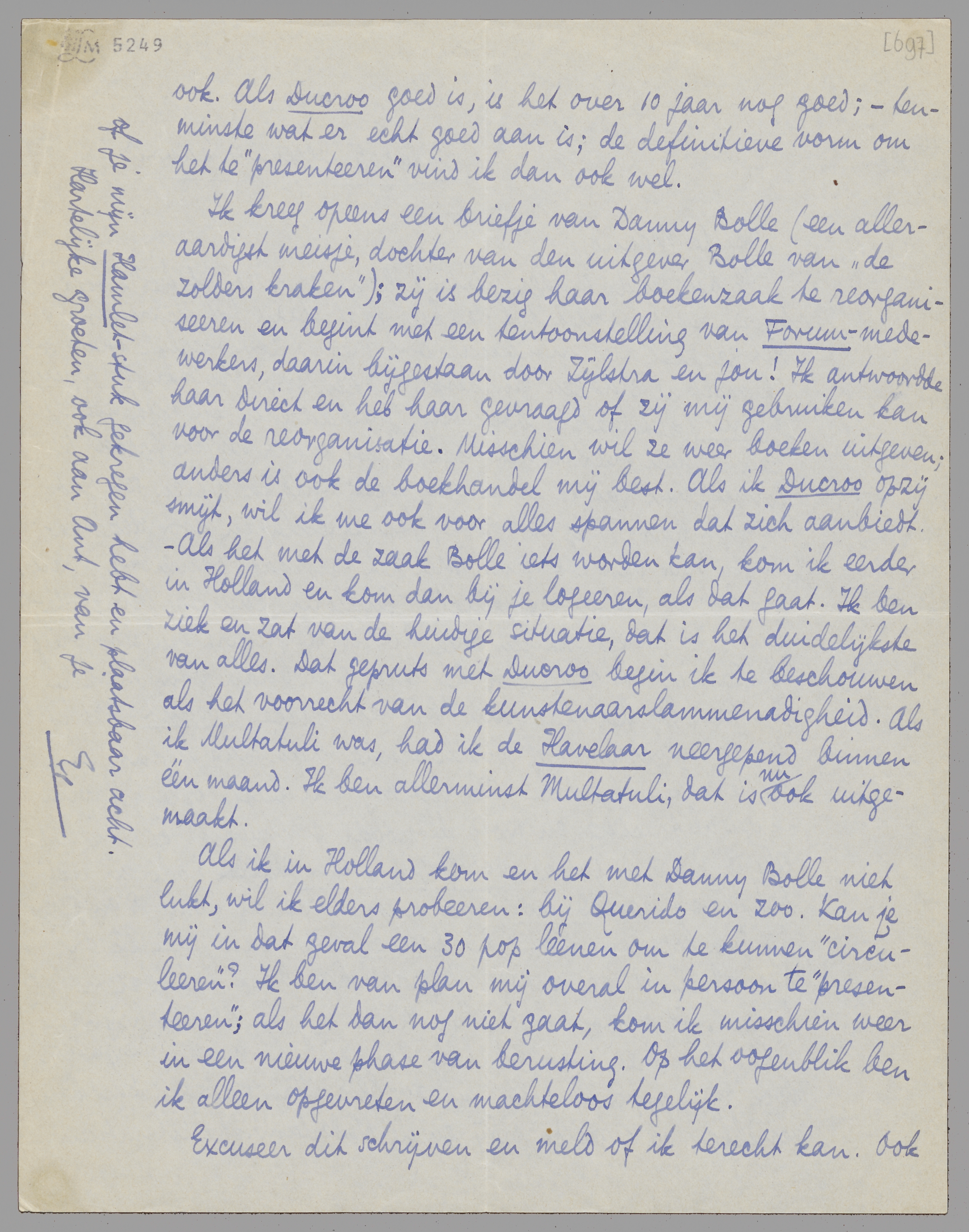 Ik kreeg opeens een briefje van Danny Bolle (een alleraardigst meisje, dochter van den uitgever Bolle van ‘de zolders kraken’); zij is bezig haar boekenzaak te reorganiseeren en begint met een tentoonstelling van Forum-medewerkers, daarin bijgestaan door Zijlstra en jou! Ik antwoordde haar direct en heb haar gevraagd of zij mij gebruiken kan voor de reorganisatie. Misschien wil ze weer boeken uitgeven; anders is ook de boekhandel mij best. Als ik Ducroo opzij smijt, wil ik me ook voor alles spannen dat zich aanbiedt. - Als het met de zaak Bolle iets worden kan, kom ik eerder in Holland en kom dan bij je logeeren, als dat gaat. Ik ben ziek en zat van de huidige situatie, dat is het duidelijkste van alles. Dat gepruts met Ducroo begin ik te beschouwen als het voorrecht van de kunstenaarslammenadigheid. Als ik Multatuli was, had ik de Havelaar neergepend binnen één maand. Ik ben allerminst Multatuli, dat is nu ook uitgemaakt.