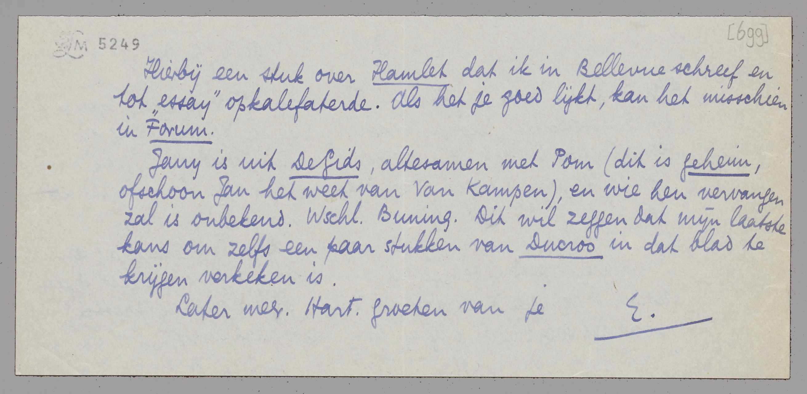 Jany is uit De Gids, altesamen met Pom (dit is geheim, ofschoon Jan het weet van Van Kampen), en wie hen vervangen zal is onbekend. Wschl. Buning. Dit wil zeggen dat mijn laatste kans om zelfs een paar stukken van Ducroo in dat blad te krijgen verkeken is.