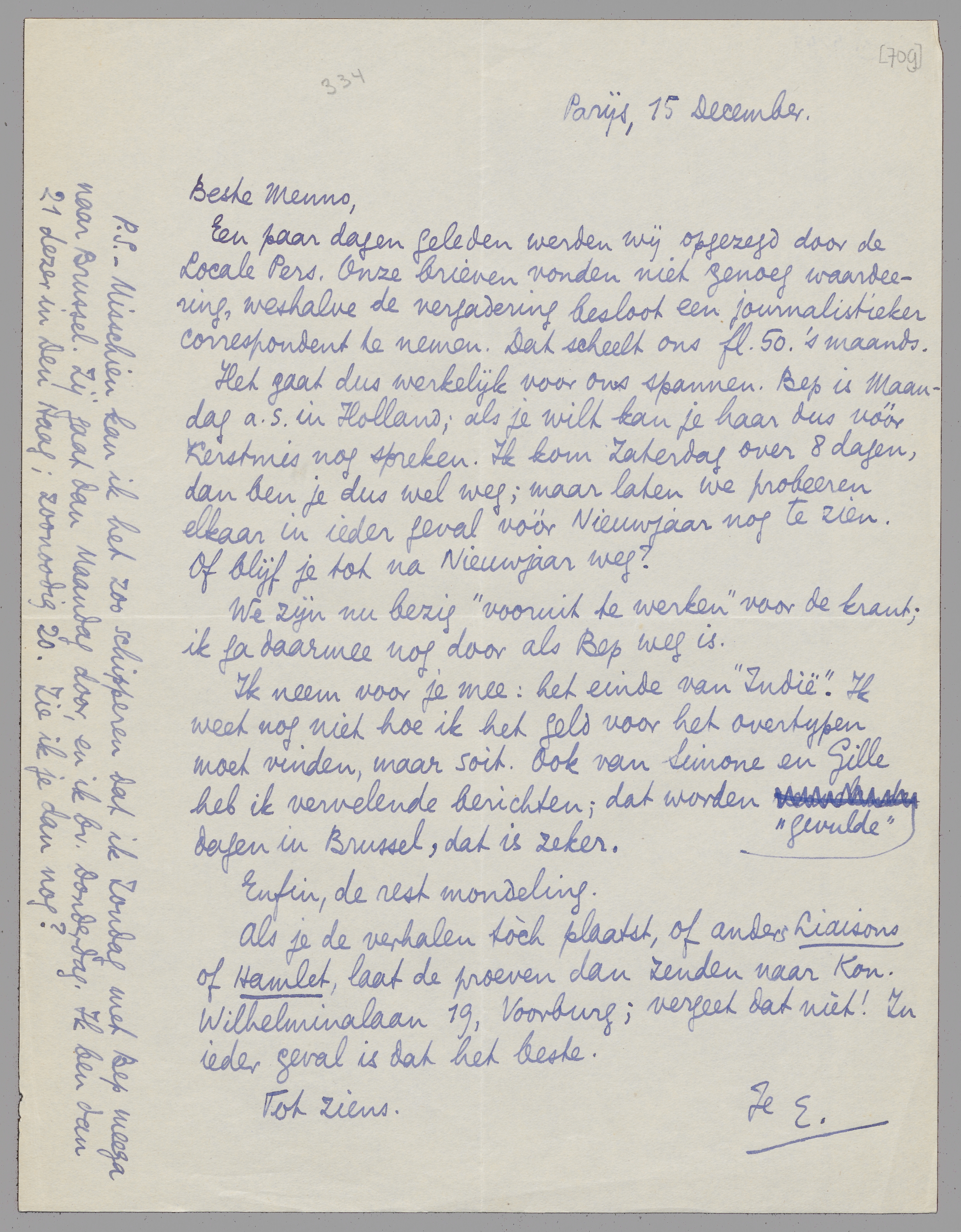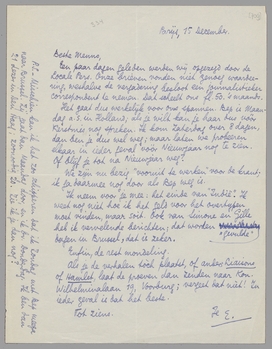 P.S. - Misschien kan ik het zoo schipperen dat ik Zondag met Bep meega naar Brussel. Zij gaat dan Maandag door, en ik bv. Donderdag. Ik ben dan 21 dezer in Den Haag; zoonoodig 20. Zie ik je dan nog?