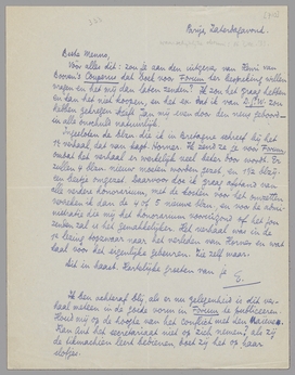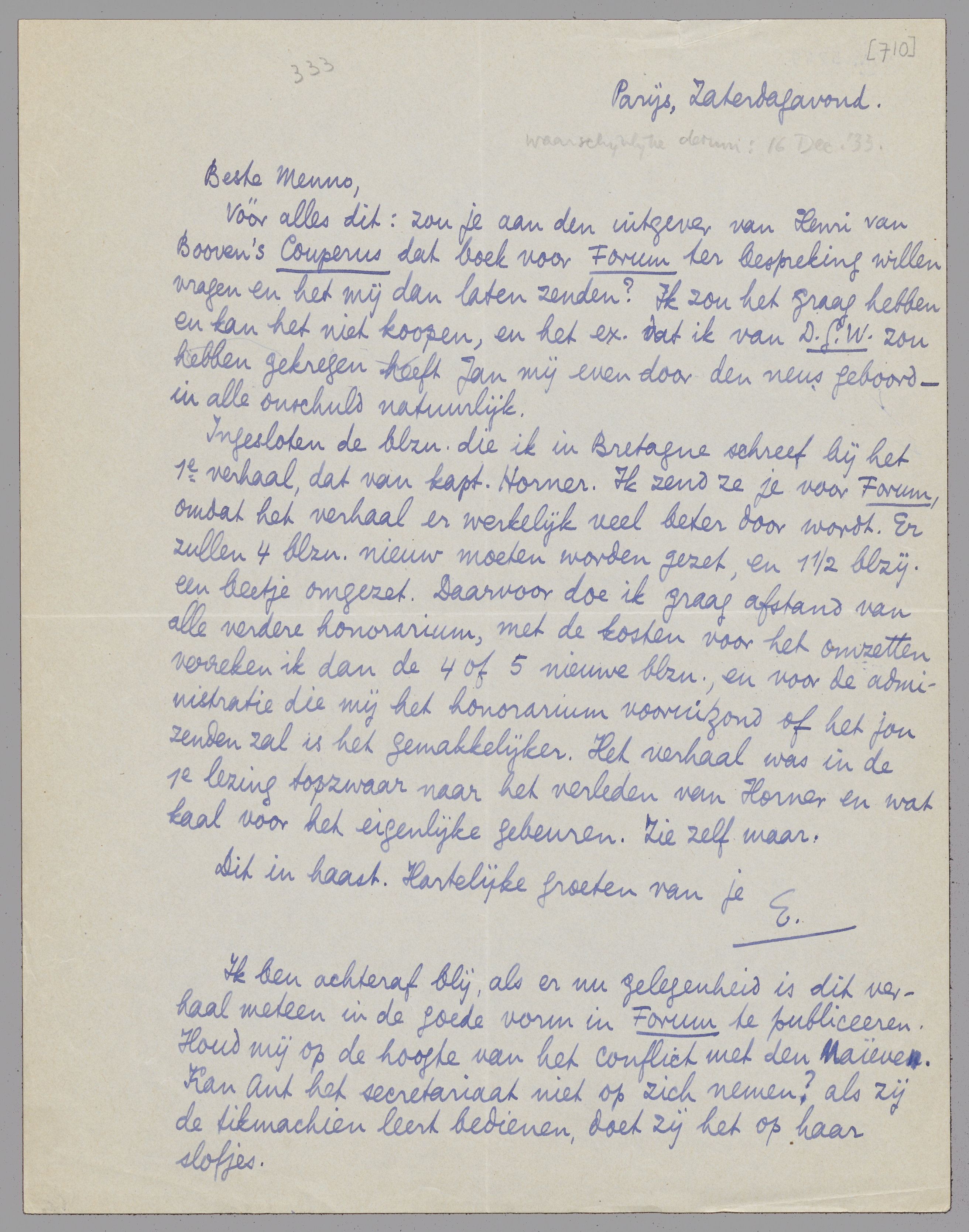Ingesloten de blzn. die ik in Bretagne schreef bij het 1e verhaal, dat van kapt. Horner. Ik zend ze je voor Forum, omdat het verhaal er werkelijk veel beter door wordt. Er zullen 4 blzn. nieuw moeten worden gezet, en 1½ blzij. een beetje omgezet. Daarvoor doe ik graag afstand van alle verdere honorarium, met de kosten voor het omzetten verreken ik dan de 4 of 5 nieuwe blzn., en voor de administratie die mij het honorarium vooruitzond of het jou zenden zal is het gemakkelijker. Het verhaal was in de 1e lezing topzwaar naar het verleden van Horner en wat kaal voor het eigenlijke gebeuren. Zie zelf maar.