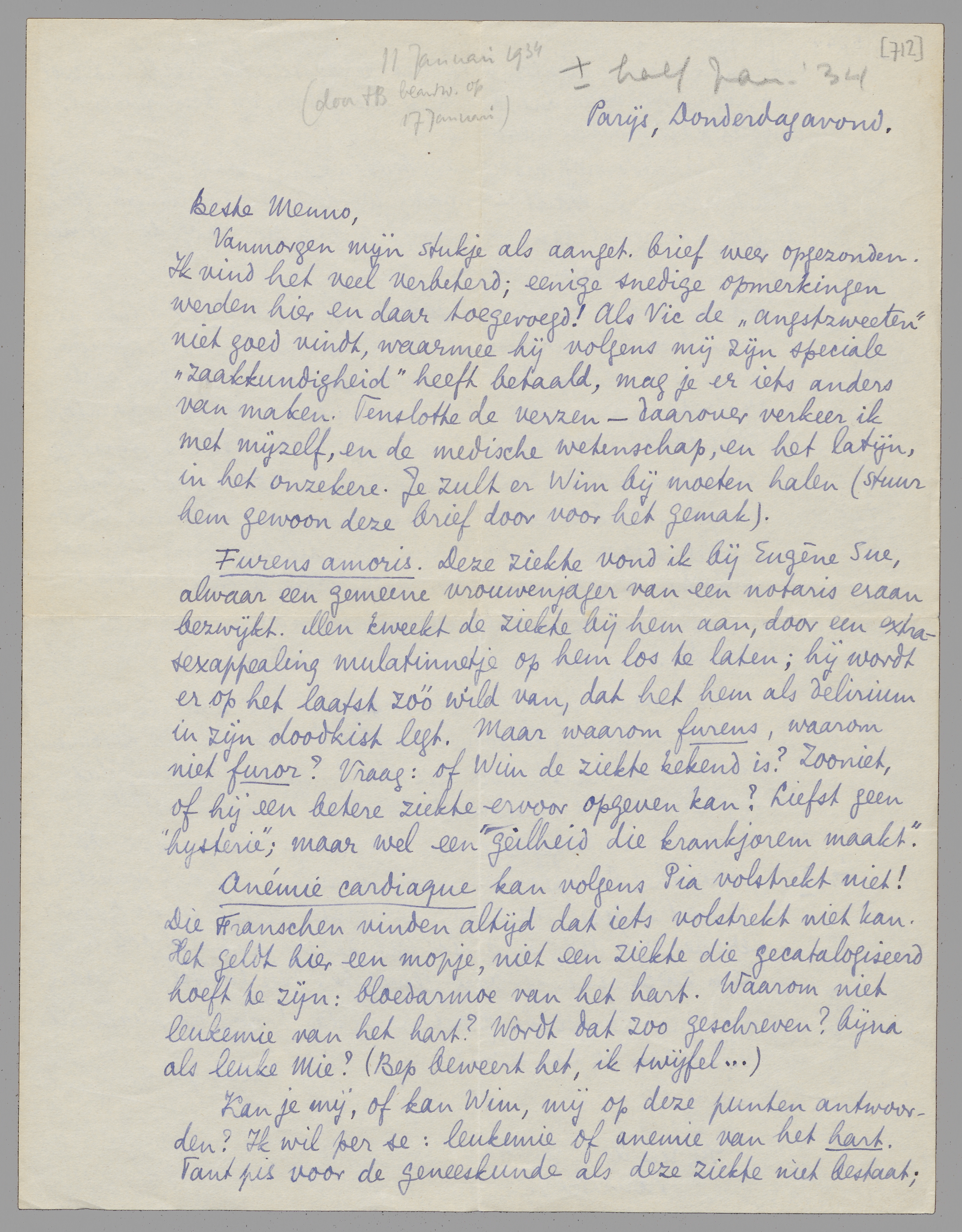 Furens amoris. Deze ziekte vond ik bij Eugène Sue, alwaar een gemeene vrouwenjager van een notaris eraan bezwijkt. Men kweekt de ziekte bij hem aan, door een extra-sexappealing mulatinnetje op hem los te laten; hij wordt er op het laatst zóó wild van, dat het hem als delirium in zijn doodkist legt. Maar waarom furens, waarom niet furor? Vraag: of Wim de ziekte bekend is? Zooniet, of hij een betere ziekte ervoor opgeven kan? Liefst geen ‘hysterie’; maar wel een ‘geilheid die krankjorem maakt’.