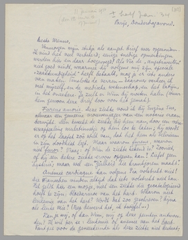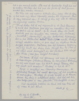 Vanmorgen mijn stukje als aanget. brief weer opgezonden. Ik vind het veel verbeterd; eenige snedige opmerkingen werden hier en daar toegevoegd! Als Vic de ‘angstzweeten’ niet goed vindt, waarmee hij volgens mij zijn speciale ‘zaakkundigheid’ heeft betaald, mag je er iets anders van maken. Tenslotte de verzen - daarover verkeer ik met mijzelf, en de medische wetenschap, en het latijn, in het onzekere. Je zult er Wim bij moeten halen (stuur hem gewoon deze brief door voor het gemak).