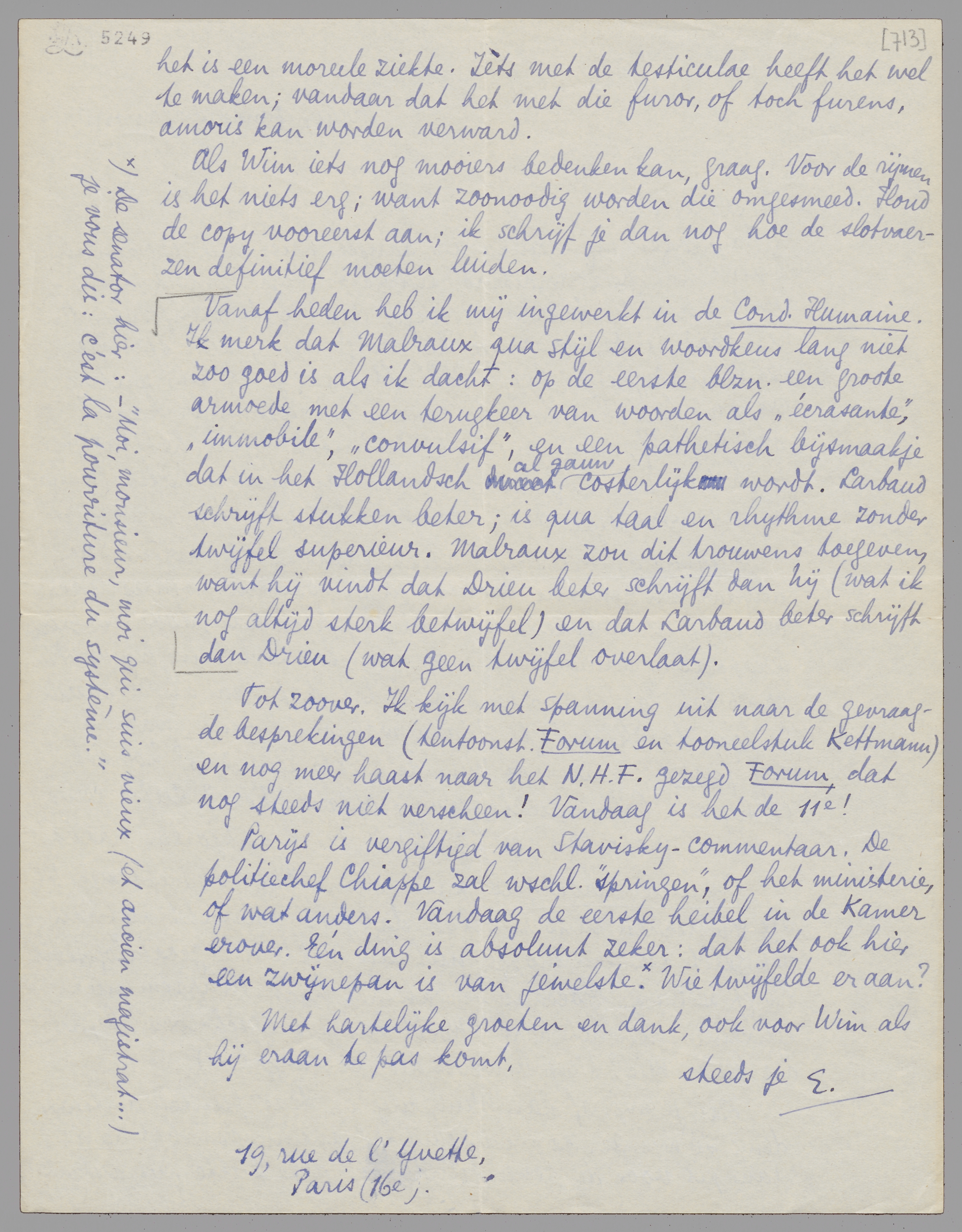 Vanaf heden heb ik mij ingewerkt in de Cond. Humaine. Ik merk dat Malraux qua stijl en woordkeus lang niet zoo goed is als ik dacht: op de eerste blzn. een groote armoede met een terugkeer van woorden als ‘écrasante’, ‘immobile’, ‘convulsif’, en een pathetisch bijsmaakje dat in het Hollandsch al gauw costerlijk wordt. Larbaud schrijft stukken beter; is qua taal en rhythme zonder twijfel superieur. Malraux zou dit trouwens toegeven, want hij vindt dat Drieu beter schrijft dan hij (wat ik nog altijd sterk betwijfel) en dat Larbaud beter schrijft dan Drieu (wat geen twijfel overlaat).