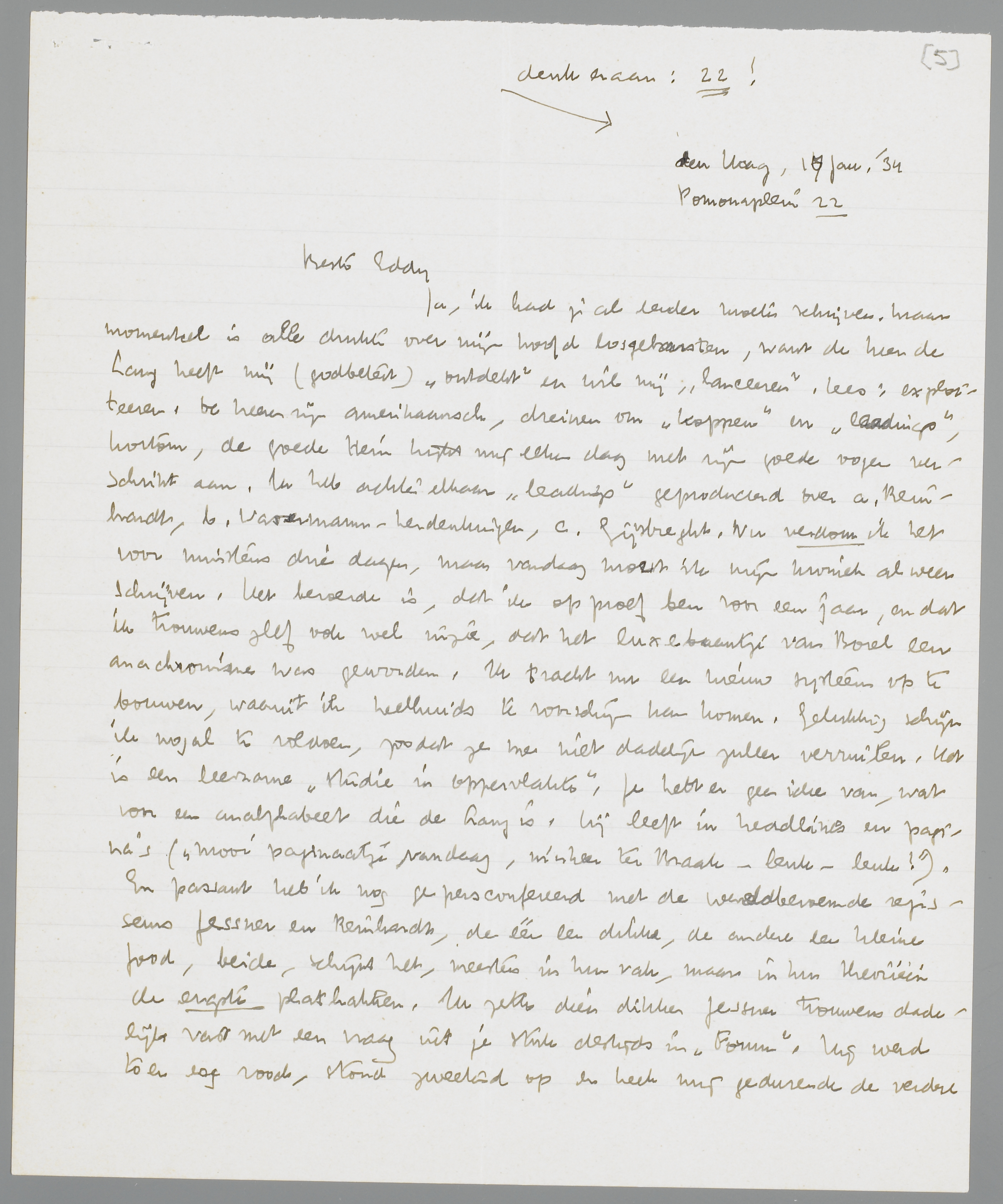 Ja, ik had je al eerder moeten schrijven. Maar momenteel is alle drukte over mijn hoofd losgebarsten, want de heer de Lang heeft mij (godbetert) ‘ontdekt’ en wil mij ‘lanceeren’, lees: exploiteeren. De heeren zijn amerikaansch, dreinen om ‘koppen’ en ‘leadings’, kortom, de goede Hein kijkt mij elken dag met zijn goede oogen verschrikt aan. Ik heb achter elkaar ‘leadings’ geproduceerd over a. Reinhardt, b. Wassermann-herdenkingen, c. Gijsbreght. Nu verdom ik het voor minstens drie dagen, maar vandaag moet ik mijn kroniek al weer schrijven. Het beroerde is, dat ik op proef ben voor een jaar, en dat ik trouwens zelf ook wel inzie, dat het luxebaantje van Borel een anachronisme was geworden. Ik tracht nu een nieuw systeem op te bouwen, waaruit ik heelhuids te voorschijn kan komen. Gelukkig schijn ik nogal te voldoen, zoodat ze me niet dadelijk zullen verruilen. Het is een leerzame ‘studie in oppervlakte’. Je hebt er geen idee van, wat voor een analphabeet die de Lang is. Hij leeft in headlines en pagina's (‘mooi paginaatje vandaag, m'nheer ter Braak - leuk - leuk!’). En passant heb ik nog gepersconfereerd met de wereldberoemde regisseurs Jessner en Reinhardt, de één een dikke, de andere een kleine Jood, beide, schijnt het, meesters in hun vak, maar in hun theorieën de ergste plathakken. Ik zette dien dikken Jessner trouwens dadelijk vast met een vraag uit je stuk destijds in Forum. Hij werd toen erg rood, stond zweetend op en keek mij gedurende de verdere zitting telkens moorddadig aan. Gelukkig heb ik onderwijl een scherp panopticum over het fascisme en een artikel over het Oeralinda - boek kunnen schrijven, beide nogal geslaagd vind ik. Je ziet ze wel in Februari; ook jouw stukje over Mme N. is naar de zetterij. Vestdijk komt dikwijls aan, het doet hem kennelijk goed; hij schrijft hard, is aan een roman begonnen en heeft een werkelijk meesterlijk stuk over Joyce geschreven. Vooral het eerste hoofdstuk is uitstekend.