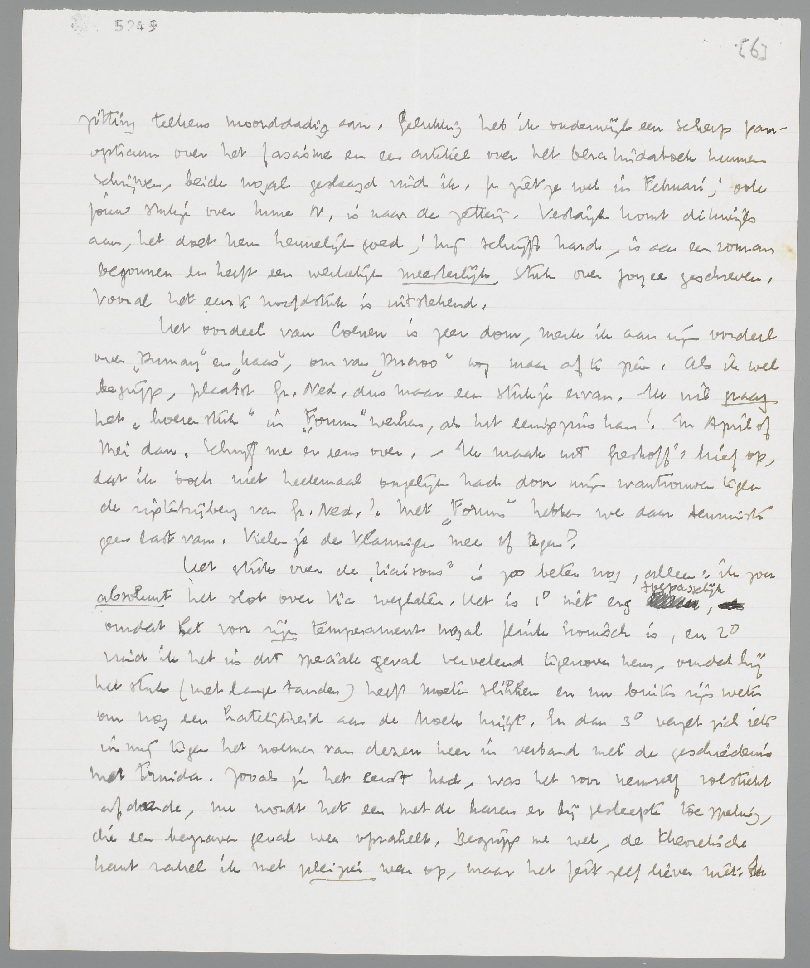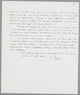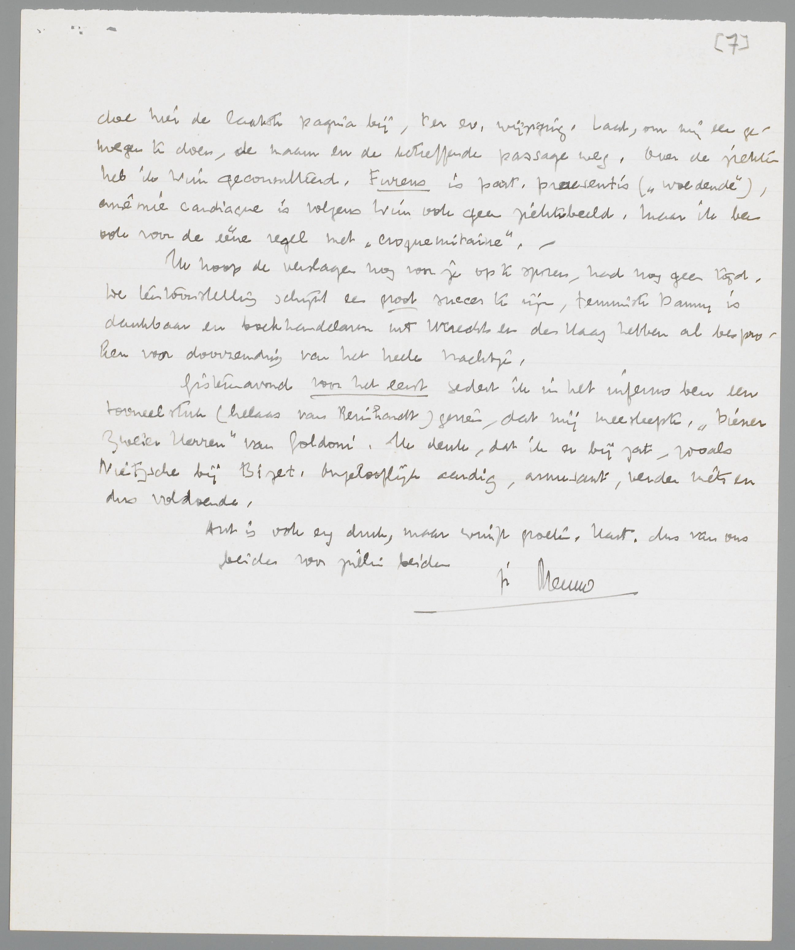 Het stuk over de Liaisons is zoo beter nog, alleen: ik zou absoluut het slot over Vic weglaten. Het is 1o niet erg toepasselijk, omdat het voor zijn temperament nogal flink ironisch is, en 2o vind ik het in dit speciale geval vervelend tegenover hem, omdat hij het stuk (met lange tanden) heeft moeten slikken en nu buiten zijn weten om nog een hatelijkheid aan de broek krijgt. En dan 3o verzet zich iets in mij tegen het noemen van dezen heer in verband met de geschiedenis met Truida. Zooals je het eerst had, was het voor hemzelf volstrekt afdoende, nu wordt het een met de haren er bij gesleepte toespeling, die een begraven geval weer oprakelt. Begrijp me wel, de theoretische kant rakel ik met plezier weer op, maar het feit zelf liever niet; Ik doe hier de laatste pagina bij, ter ev. wijziging. Laat, om mij een genoegen te doen, de naam en de betreffende passage weg. Over de ziekten heb ik Wim geconsulteerd. Furens is part. presentis (‘woedende’), anémie cardiaque is volgens Wim ook geen ziektebeeld. Maar ik ben ook voor de ééne regel met ‘croquemitaine’. -