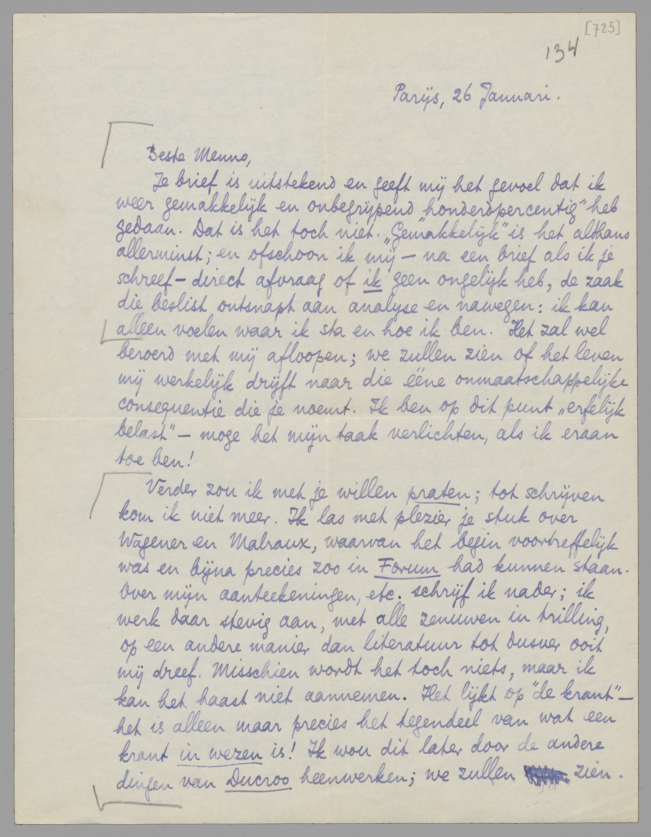 Verder zou ik met je willen praten; tot schrijven kom ik niet meer. Ik las met plezier je stuk over Wagener en Malraux, waarvan het begin voortreffelijk was en bijna precies zoo in Forum had kunnen staan. Over mijn aanteekeningen, etc. schrijf ik nader; ik werk daar stevig aan, met alle zenuwen in trilling, op een andere manier dan literatuur tot dusver ooit mij dreef.