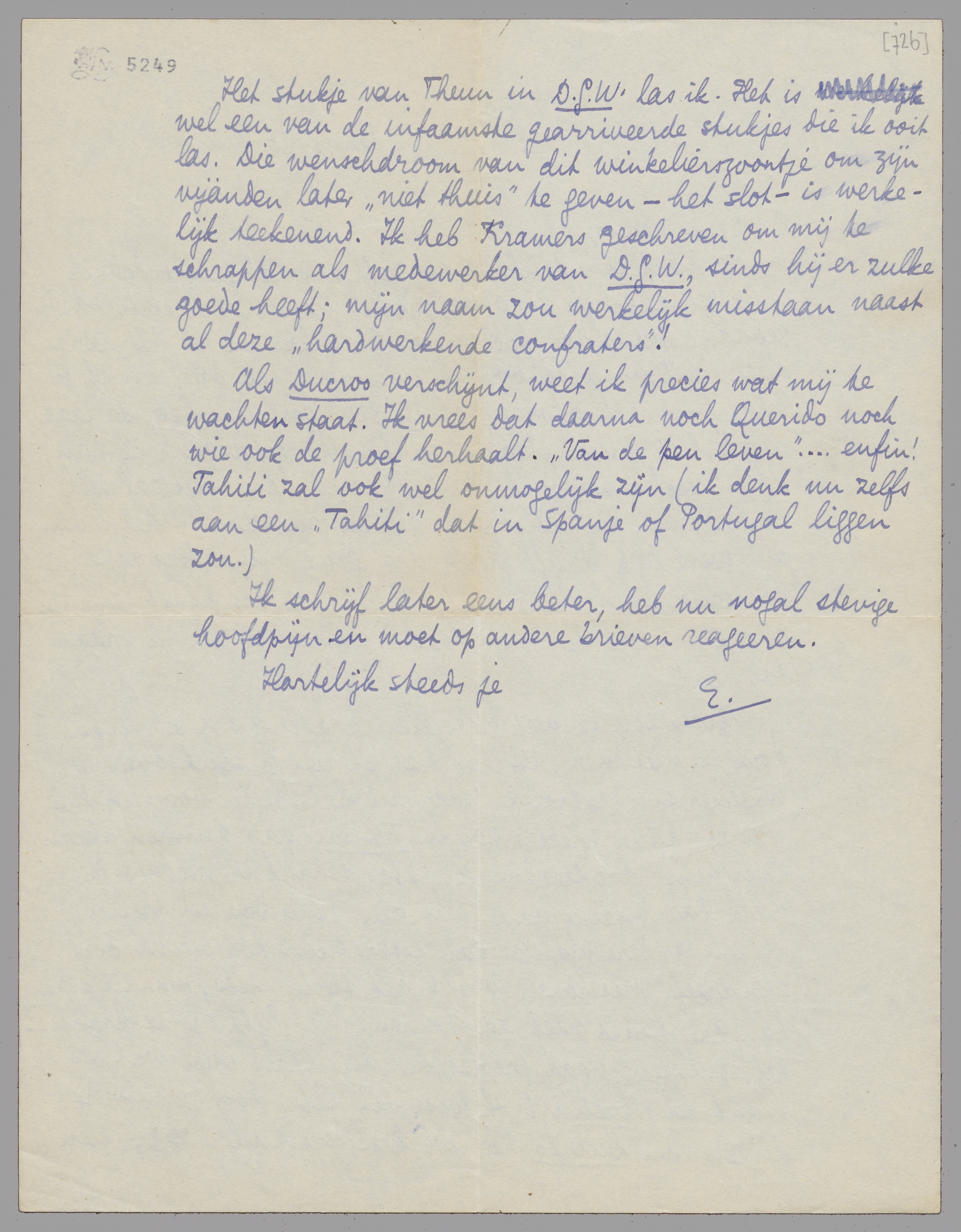 Als Ducroo verschijnt, weet ik precies wat mij te wachten staat. Ik vrees dat daarna noch Querido noch wie ook de proef herhaalt. ‘Van de pen leven’... enfin! Tahiti zal ook wel onmogelijk zijn (ik denk nu zelfs aan een ‘Tahiti’ dat in Spanje of Portugal liggen zou.)
