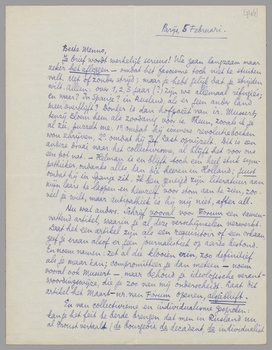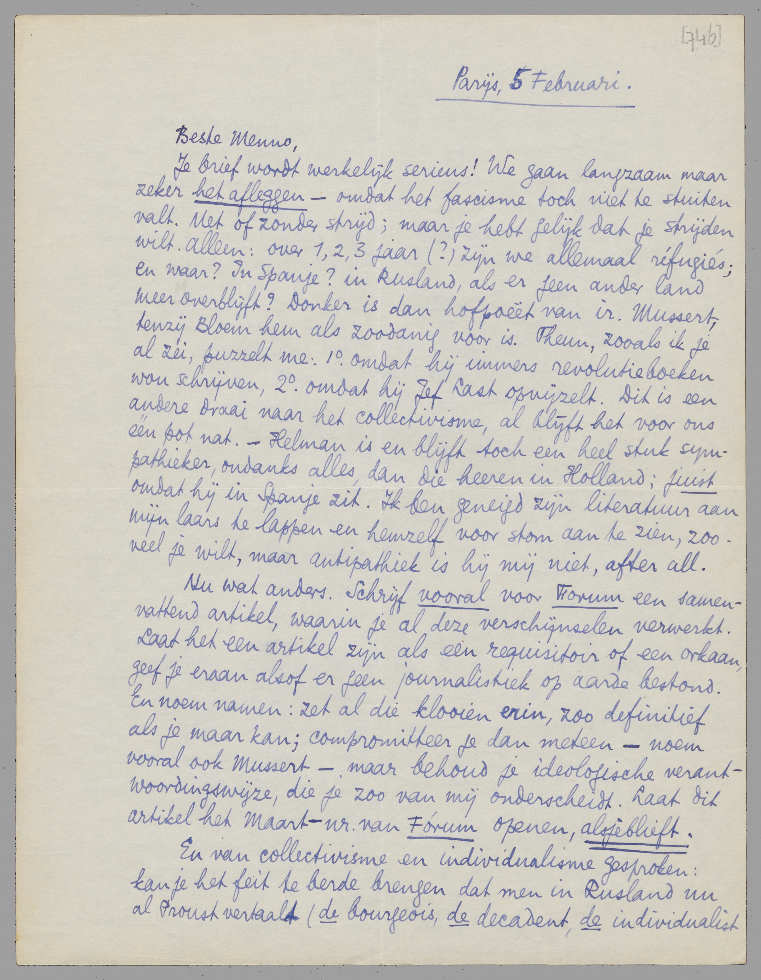 Je brief wordt werkelijk serieus! We gaan langzaam maar zeker het afleggen - omdat het fascisme toch niet te stuiten valt. Met of zonder strijd; maar je hebt gelijk dat je strijden wilt. Alleen: over 1, 2, 3 jaar (?) zijn we allemaal réfugiés; en waar? In Spanje? in Rusland, als er geen ander land meer overblijft? Donker is dan hofpoëet van ir. Mussert, tenzij Bloem hem als zoodanig voor is. Theun, zooals ik je al zei, puzzelt me: 1o. omdat hij immers revolutieboeken wou schrijven, 2o. omdat hij Jef Last opvijzelt. Dit is een andere draai naar het collectivisme, al blijft het voor ons één pot nat. - Helman is en blijft toch een stuk sympathieker, ondanks alles, dan die heeren in Holland; juist omdat hij in Spanje zit. Ik ben geneigd zijn literatuur aan mijn laars te lappen en hemzelf voor stom aan te zien, zooveel je wilt, maar antipathiek is hij mij niet, after all.