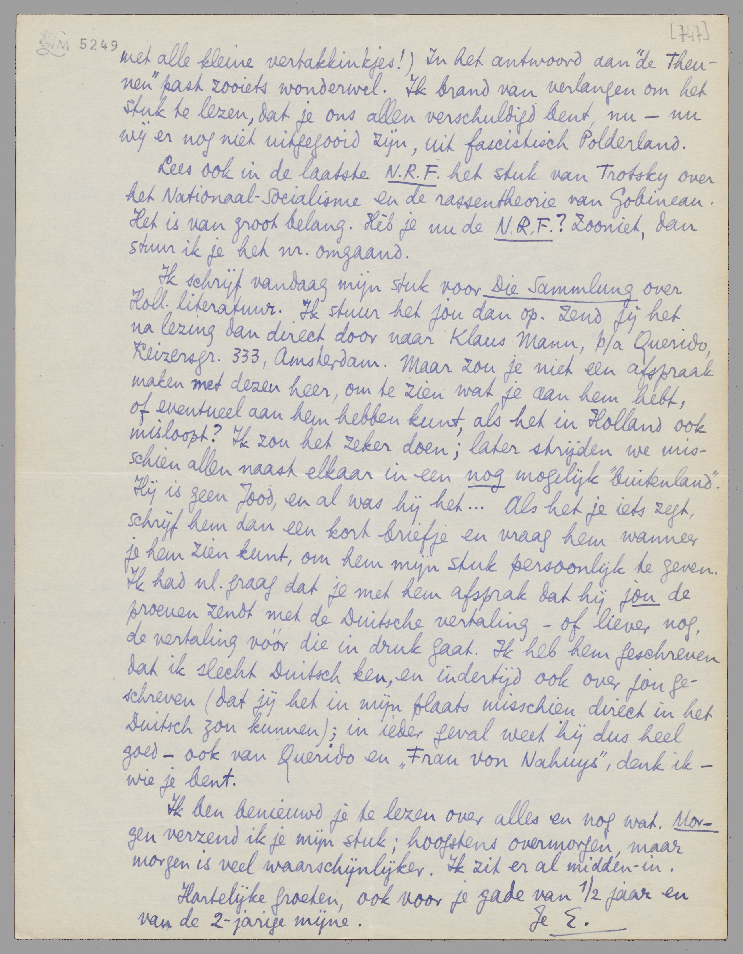 Ik schrijf vandaag mijn stuk voor Die Sammlung over Holl. literatuur. Ik stuur het jou dan op. Zend jij het na lezing dan direct door naar Klaus Mann, p/a Querido, Keizersgr. 333, Amsterdam. Maar zou je niet een afspraak maken met dezen heer, om te zien wat je aan hem hebt, of eventueel aan hem hebben kunt, als het in Holland ook misloopt? Ik zou het zeker doen; later strijden we misschien allen naast elkaar in een nog mogelijk ‘buitenland’. Hij is geen jood, en al was hij het... Als het je iets zegt, schrijf hem dan een kort briefje en vraag hem wanneer je hem zien kunt, om hem mijn stuk persoonlijk te geven. Ik had nl. graag dat je met hem afsprak dat hij jou de proeven zendt met de Duitsche vertaling - of liever nog, de vertaling vóór die in druk gaat. Ik heb hem geschreven dat ik slecht Duitsch ken, en indertijd ook over jou geschreven (dat jij het in mijn plaats misschien direct in het Duitsch zou kunnen); in ieder geval weet hij dus heel goed - ook van Querido en ‘Frau von Nahuys’, denk ik - wie je bent.