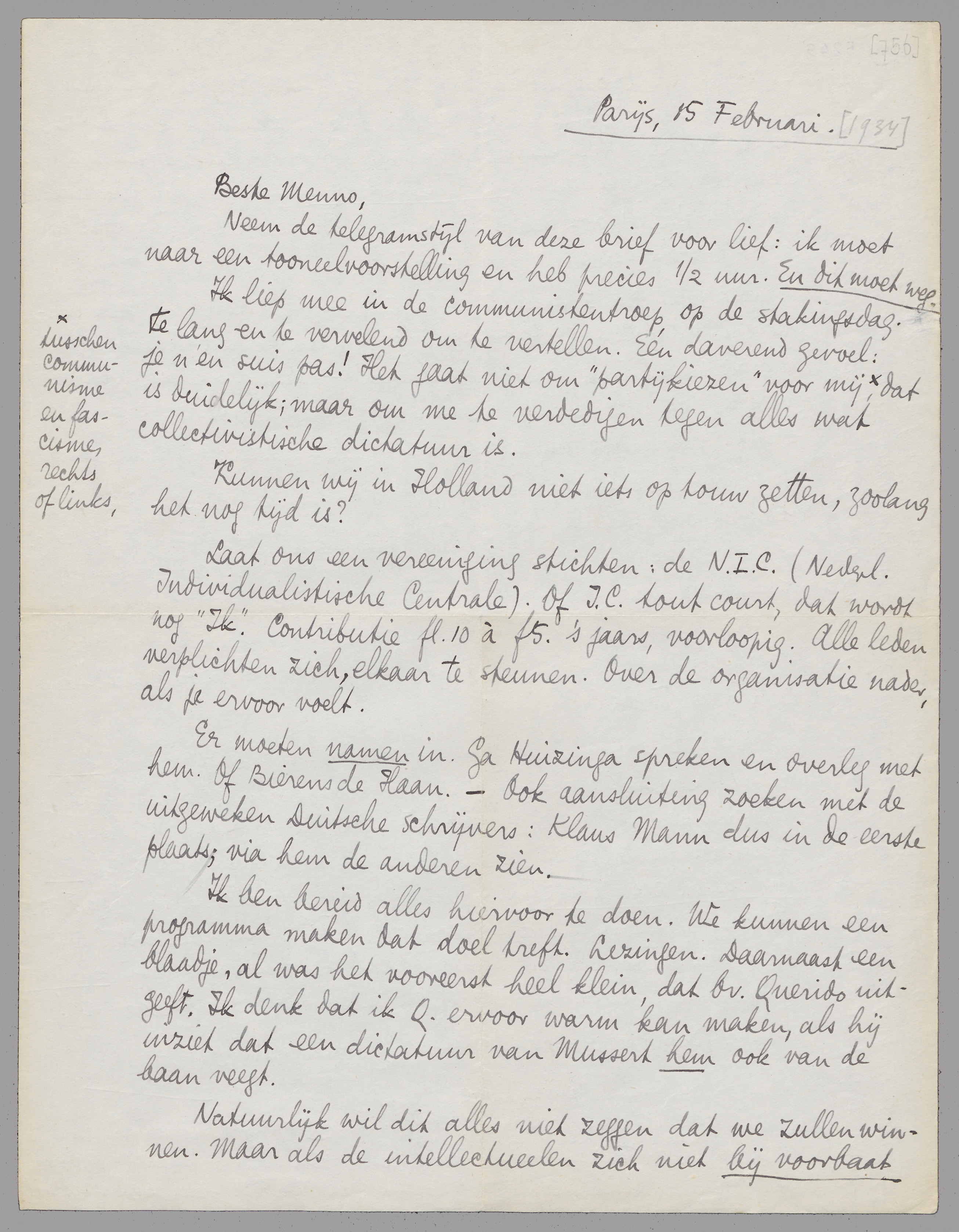 Neem de telegramstijl van deze brief voor lief: ik moet naar een tooneelvoorstelling en heb precies ½ uur. En dit moet weg. Ik liep mee in de communistentroep op de stakingsdag. Te lang en te vervelend om te vertellen. Eén daverend gevoel: je n'en suis pas! Het gaat niet om ‘partijkiezen’ voor mij, [tusschen communisme en fascisme, rechts of links,] dat is duidelijk; maar om me te verdedigen tegen alles wat collectivistische dictatuur is.