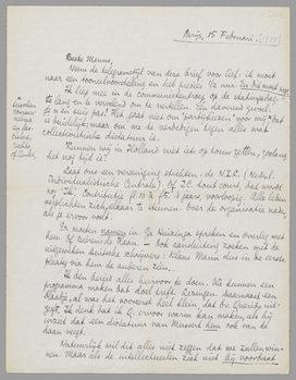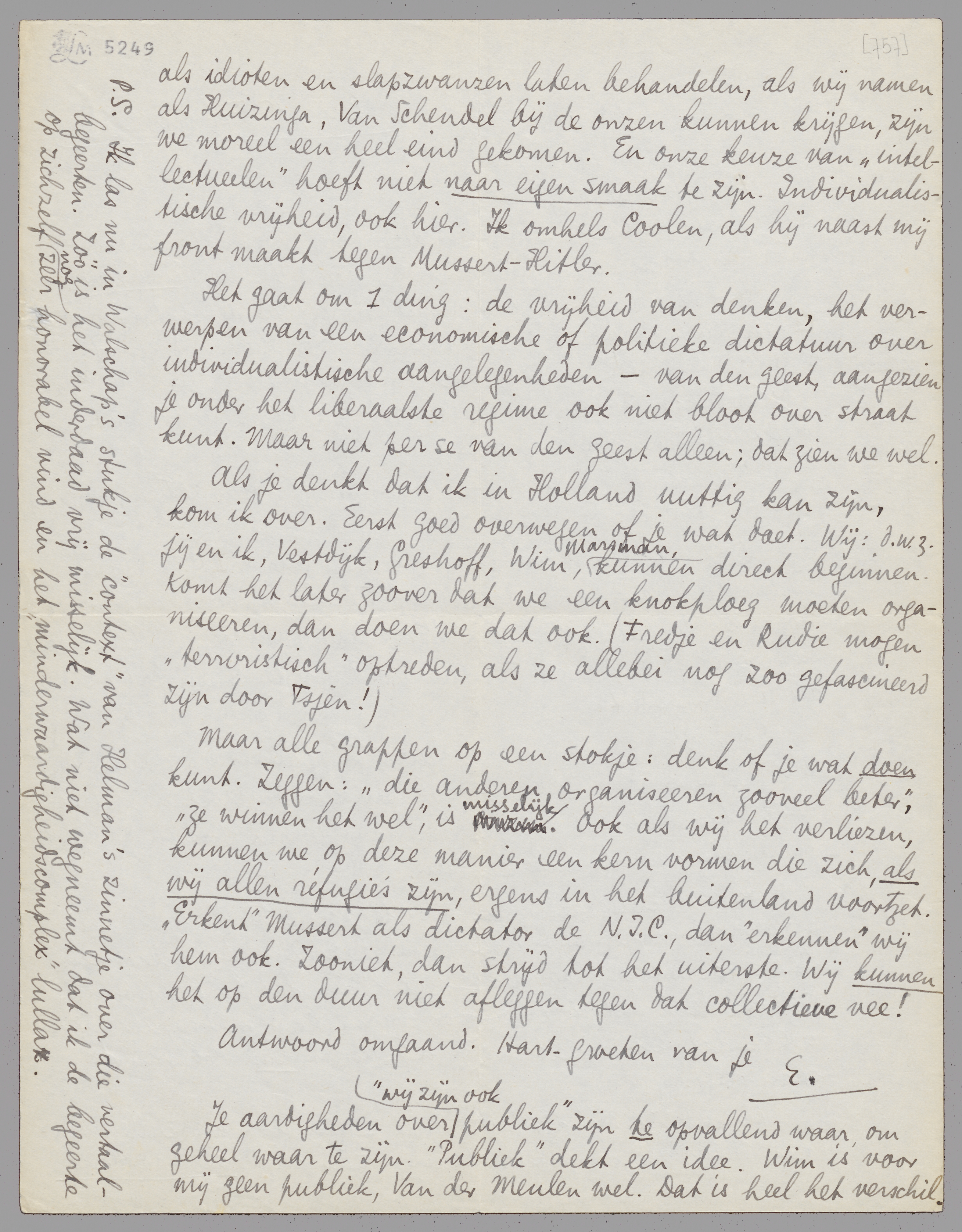 Ik ben bereid alles hiervoor te doen. We kunnen een programma maken dat doel treft. Lezingen. Daarnaast een blaadje, al was het vooreerst heel klein, dat bv. Querido uitgeeft. Ik denk dat ik Q. ervoor warm kan maken, als hij inziet dat een dictatuur van Mussert hem ook van de baan veegt.