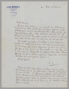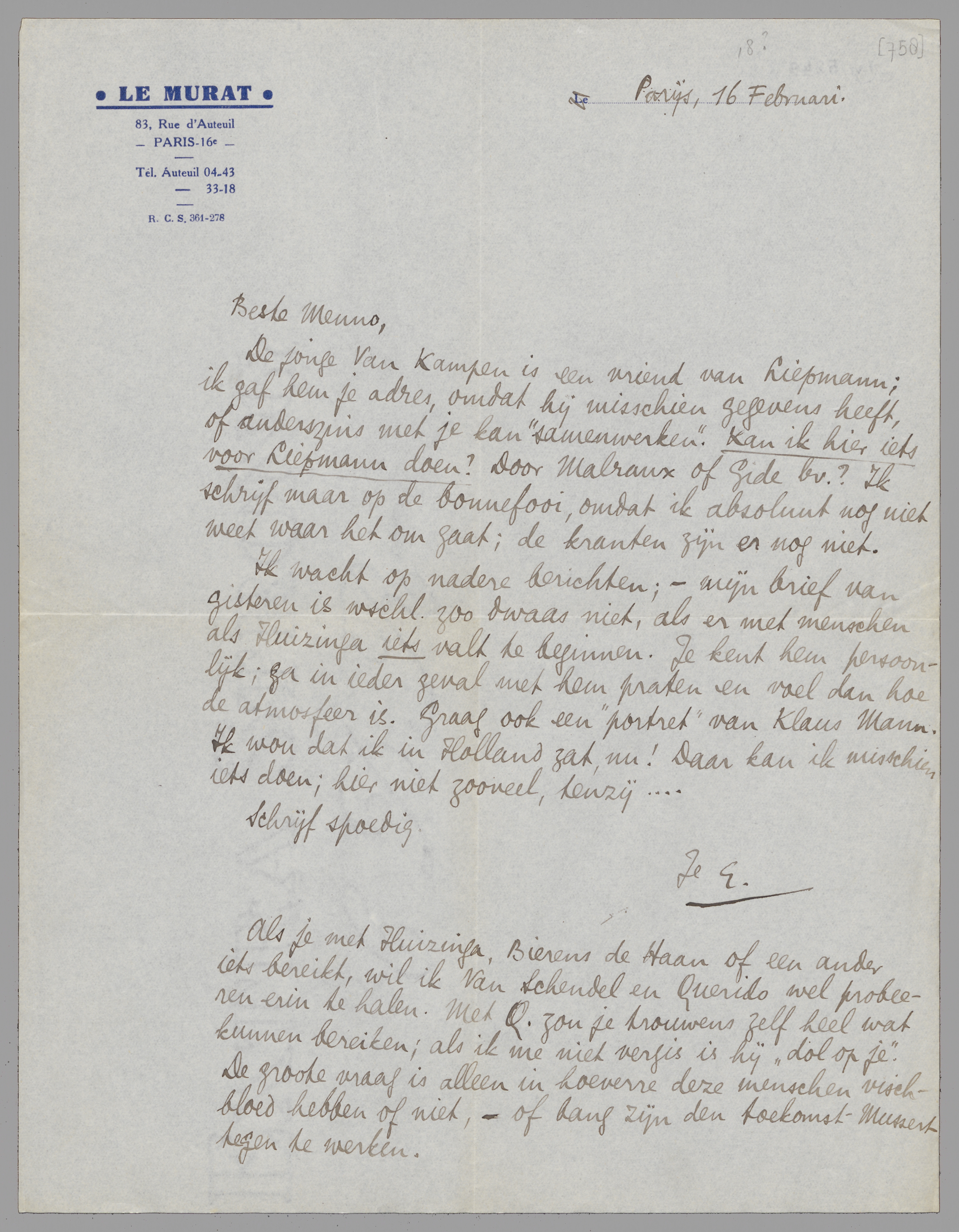 De jonge Van Kampen is een vriend van Liepmann; ik gaf hem je adres, omdat hij misschien gegevens heeft, of anderszins met je kan ‘samenwerken’. Kan ik hier iets voor Liepmann doen? Door Malraux of Gide bv.? Ik schrijf maar op de bonnefooi, omdat ik absoluut nog niet weet waar het om gaat; de kranten zijn er nog niet.