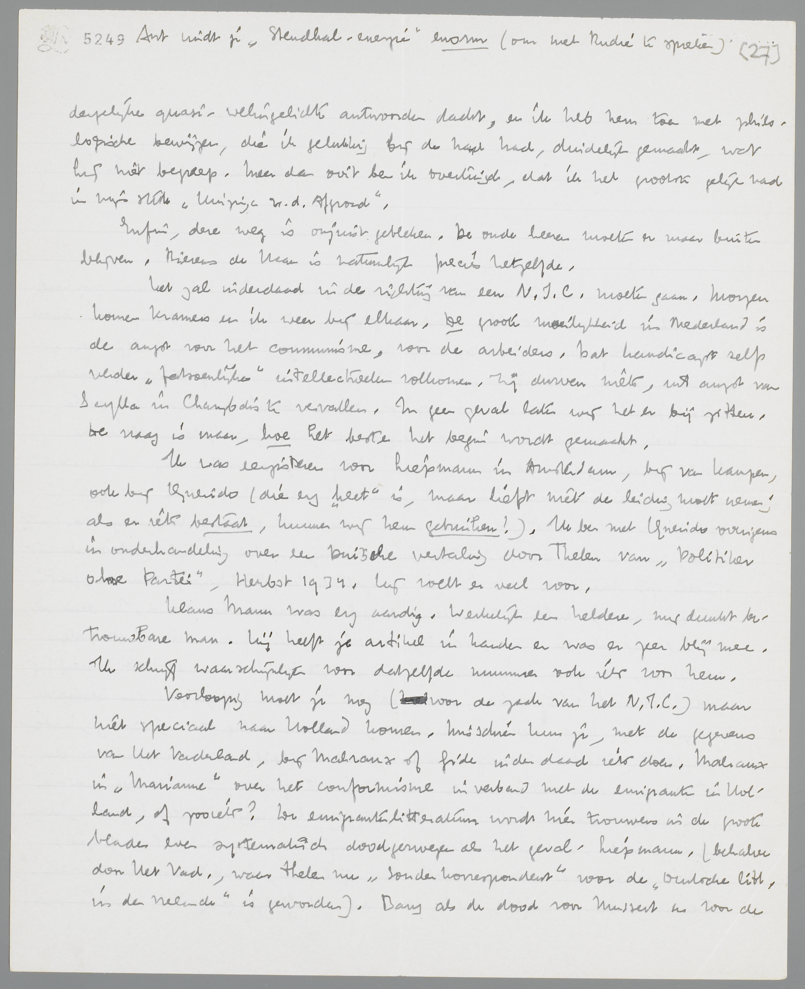 Het zal inderdaad in de richting van een N.I.C. moeten gaan. Morgen komen Kramers en ik weer bij elkaar. De groote moeilijkheid in Nederland is de angst voor het communisme, voor de arbeiders. Dat handicapt zelfs verder ‘fatsoenlijke’ intellectueelen volkomen. Zij durven niets, uit angst van Scylla in Charibdis te vervallen. In geen geval laten wij het er bij zitten. De vraag is maar, hoe het beste het begin wordt gemaakt.