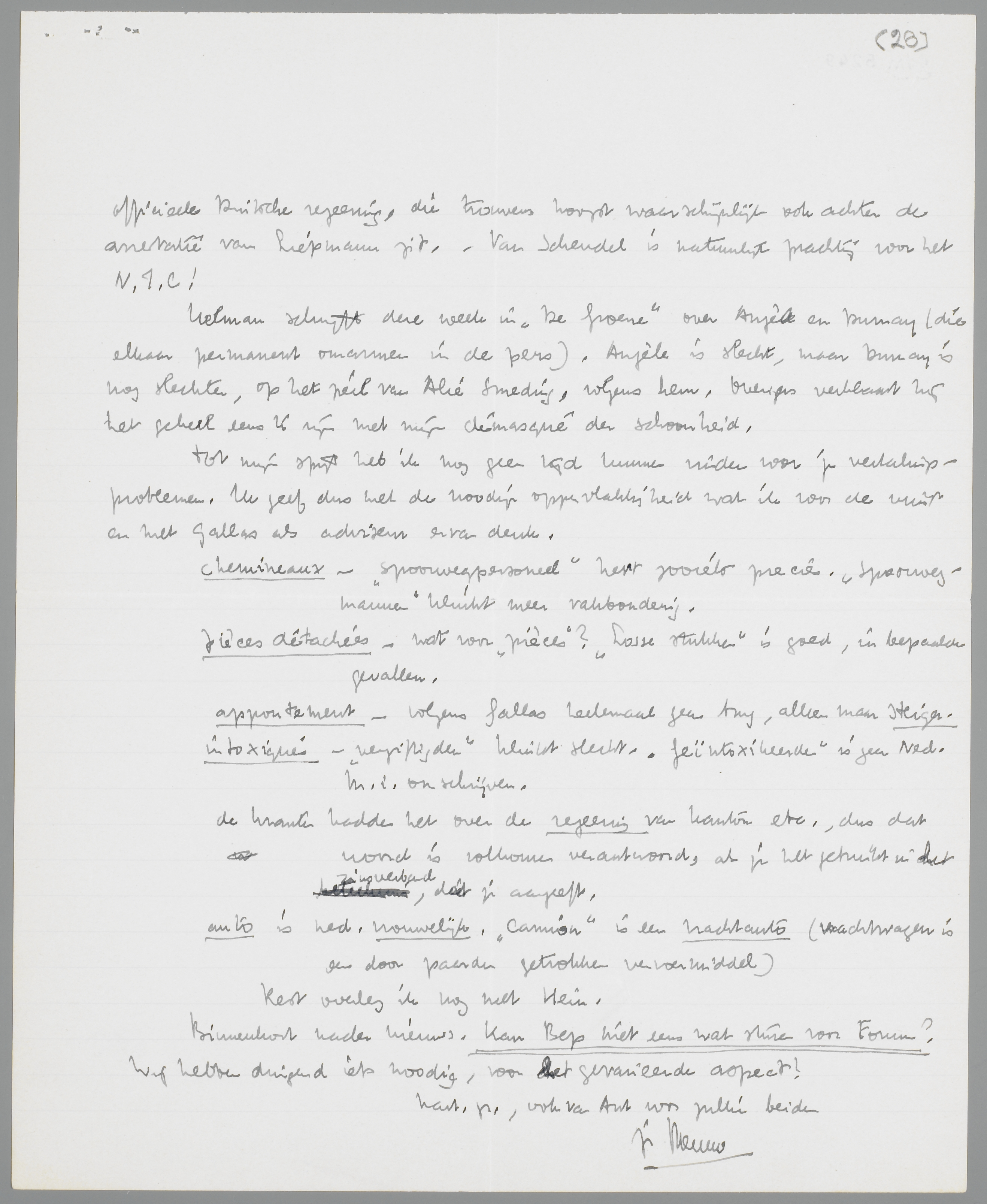 Voorloopig moet je nog (voor de zaak van het N.I.C.) maar niet speciaal naar Holland komen. Misschien kun je, met de gegevens van Het Vaderland, bij Malraux of Gide inderdaad iets doen. Malraux in Marianne over het conformisme in verband met de emigranten in Holland, of zooiets? De emigrantenlitteratuur wordt hier trouwens in de groote bladen even systematisch doodgezwegen als het geval- Liepmann. (behalve dan Het Vad., waar Thelen nu ‘Sonderkorrespondent’ voor de ‘Duitsche litt. in den vreemde’ is geworden). Bang als de dood voor Mussert en voor de officieele Duitsche regeering, die trouwens hoogst waarschijnlijk ook achter de arrestatie van Liepmann zit. - Van Schendel is natuurlijk prachtig voor het N.I.C.!