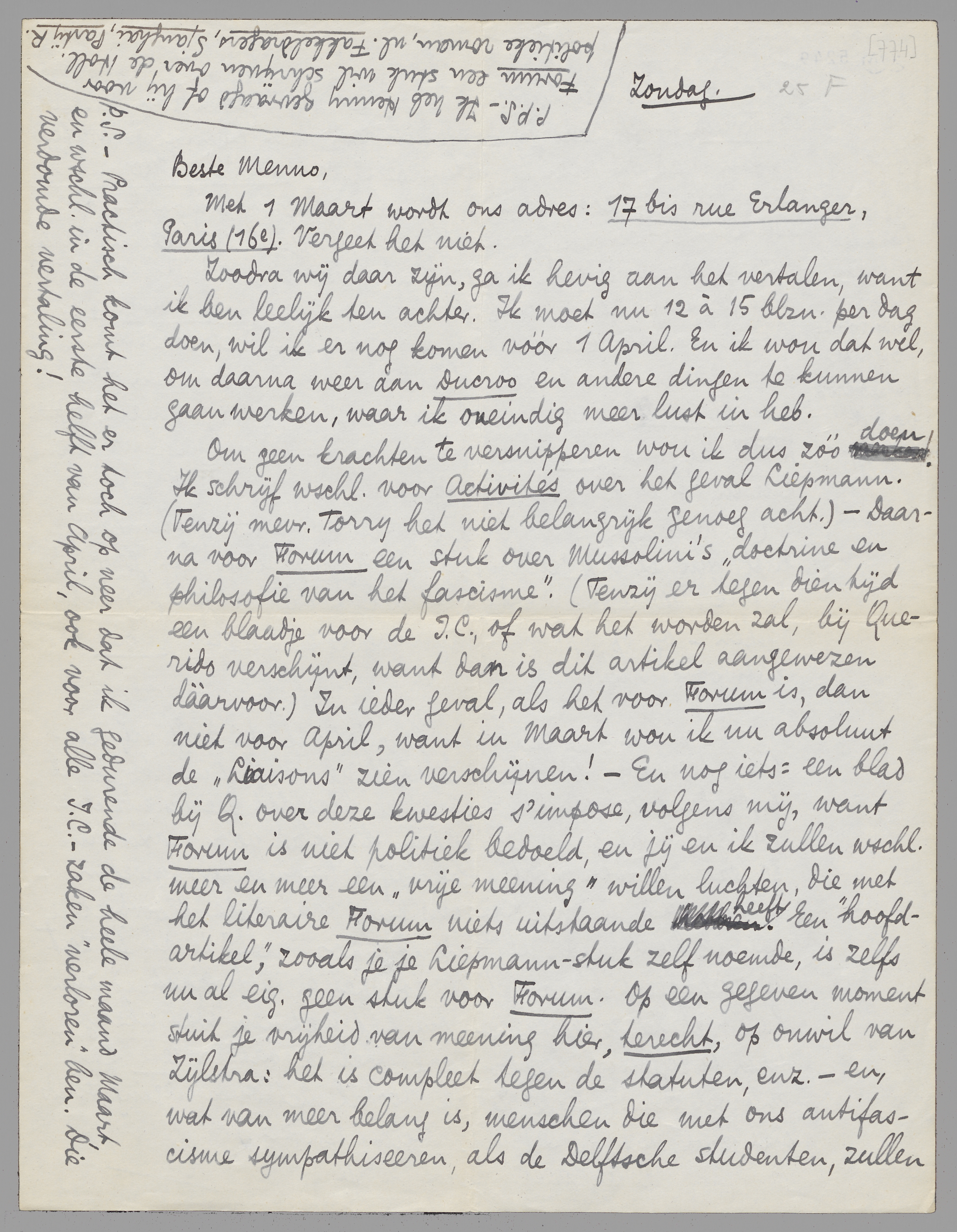 Om geen krachten te versnipperen wou ik dus zóó doen! Ik schrijf wschl. voor Activités over het geval Liepmann. (Tenzij mevr. Torry het niet belangrijk genoeg acht.) - Daarna voor Forum een stuk over Mussolini's ‘doctrine en philosofie van het fascisme’. (Tenzij er tegen dien tijd een blaadje voor de I.C., of wat het worden zal, bij Querido verschijnt, want dan is dit artikel aangewezen dààrvoor.) In ieder geval, als het voor Forum is, dan niet voor April, want in Maart wou ik nu absoluut de ‘Liaisons’ zien verschijnen! En nog iets: een blad bij Q. over deze kwesties s'impose, volgens mij, want Forum is niet politiek bedoeld, en jij en ik zullen wschl. meer en meer een ‘vrije meening’ willen luchten, die met het literaire Forum niets uitstaande heeft. Een ‘hoofdartikel’, zooals je je Liepmann-stuk zelf noemde, is zelfs nu al eig. geen stuk voor Forum. Op een gegeven moment stuit je vrijheid van meening hier, terecht, op onwil van Zijlstra: het is compleet tegen de statuten, enz. - en, wat van meer belang is, menschen die met ons antifascisme sympathiseeren, als de Delftsche studenten, zullen een ander blad verslinden, maar zich niet gaan abonneeren op Forum. - Ik raad je werkelijk aan, met Querido te praten, en een blad bij hem te ‘ontwerpen’, dat De Vrije Meening kan heeten of zooiets, en dat - als het grooter wordt - ook een tooneel- en film-rubriek kan krijgen.* Artikelen daarin over te nemen uit buitenl. bladen, als die van Soupault, raad ik sterk aan. Ook de mannen van Die Sammlung, Liepmann e.a. kunnen eraan meewerken. Het blad moet er doodeenvoudig uitzien, desnoods in 2 kolommen druk als Activités, maar veel ‘sportiever’ en meer ‘populair’. Bijv. als Lu hier, waarvan ik je wel een nr. kan zenden, als je het niet kent.