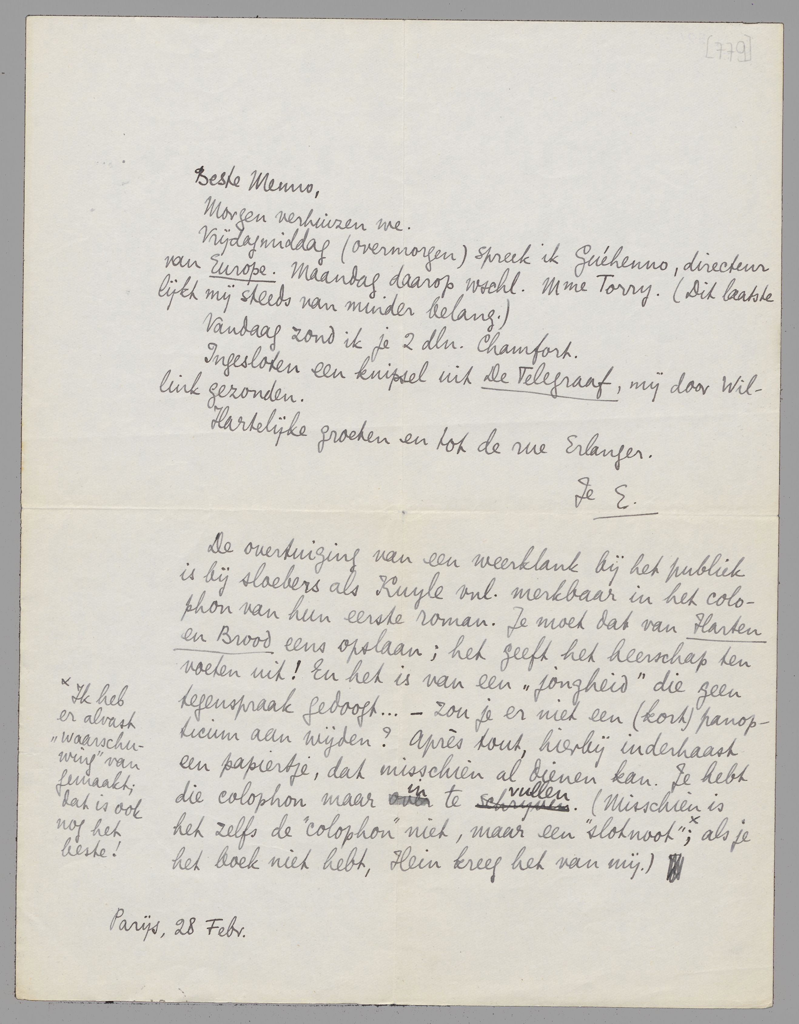 Vrijdagmiddag (overmorgen) spreek ik Guéhenno, directeur van Europe. Maandag daarop wschl. Mme Torry. (Dit laatste lijkt mij steeds van minder belang.)