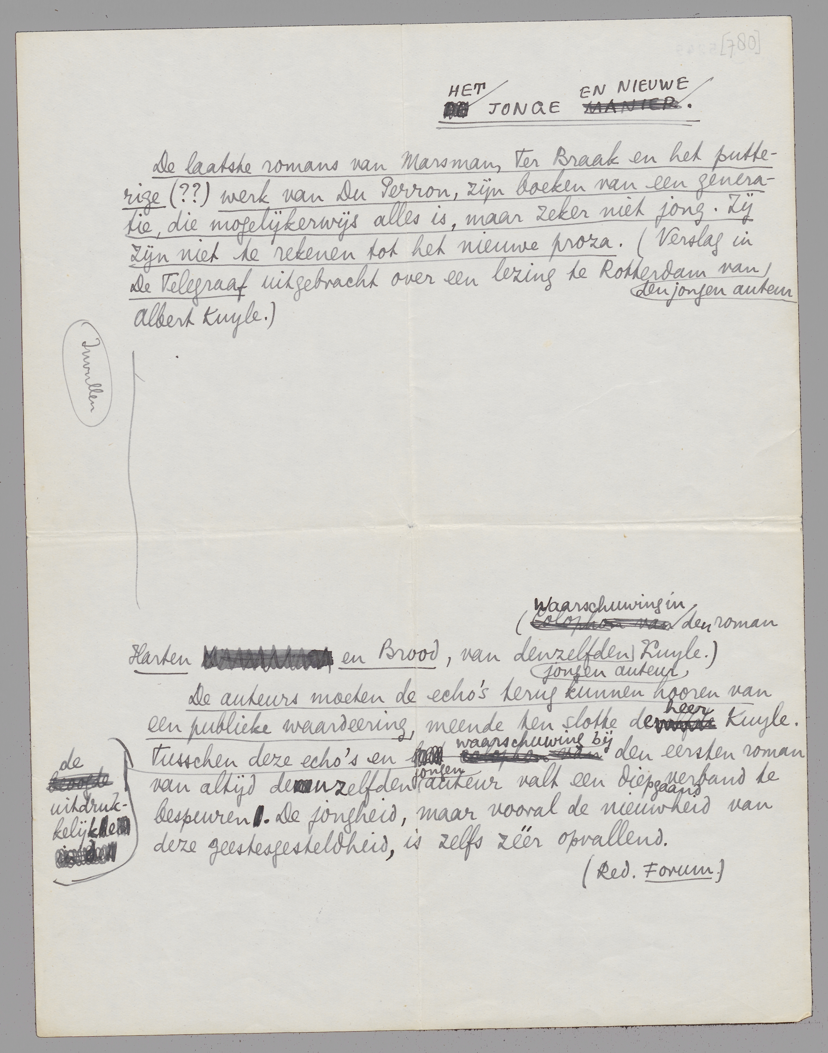 De laatste romans van Marsman, Ter Braak en het putterige(??) werk van Du Perron, zijn boeken van een generatie, die mogelijkerwijs alles is, maar zeker niet jong. Zij zijn niet te rekenen tot het nieuwe proza. (Verslag in De Telegraaf uitgebracht over een lezing te Rotterdam van den jongen auteur Albert Kuyle.)