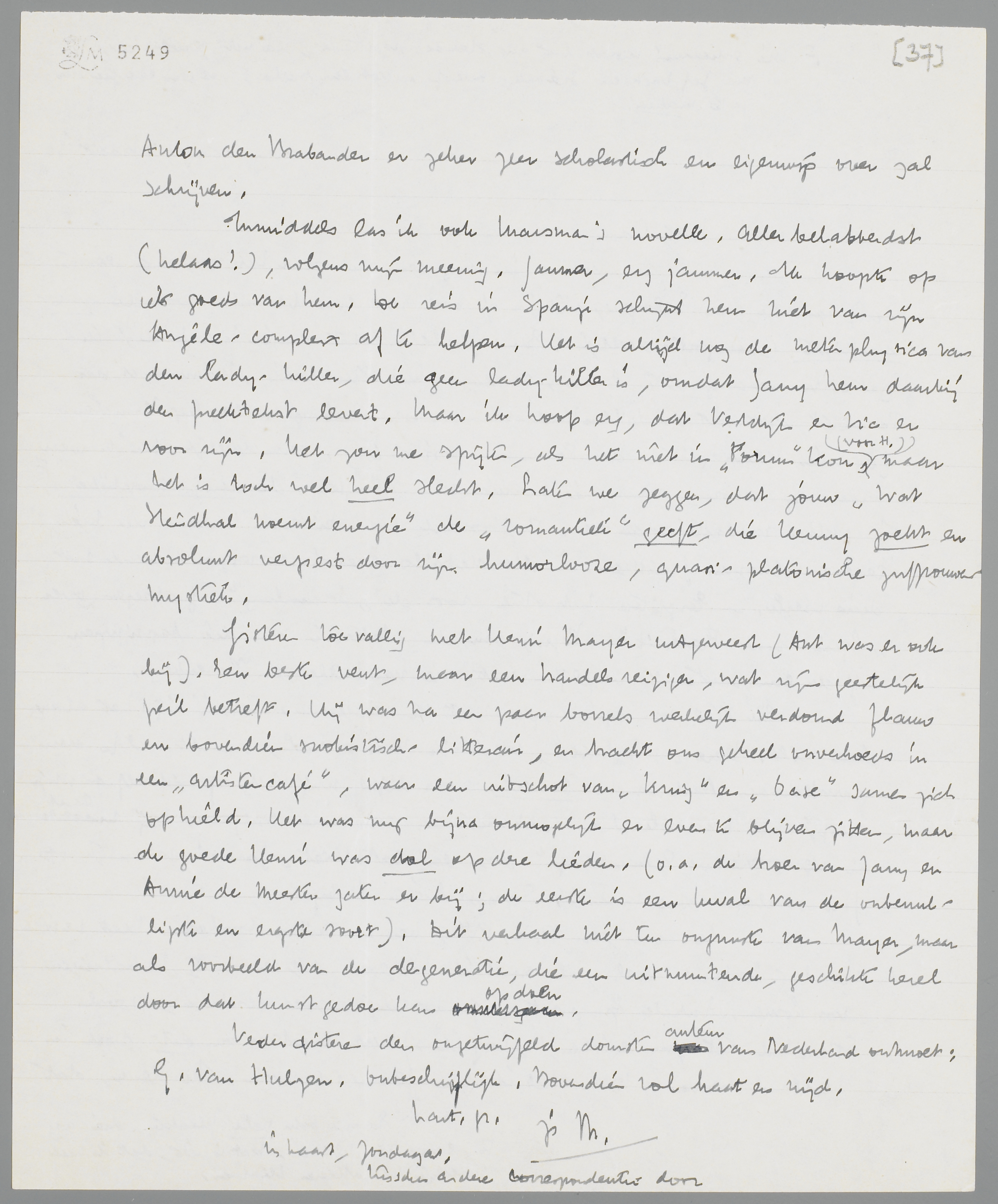 Inmiddels las ik ook Marsman's novelle. Allerbelabberdst (helaas!), volgens mijn meening. Jammer, erg jammer. Ik hoopte op iets goeds van hem. De reis in Spanje schijnt hem niet van zijn Angèle-complex af te helpen. Het is altijd nog de metaphysica van den lady-killer, die geen lady-killer is, omdat Jany hem daarbij den preektekst levert. Maar ik hoop erg, dat Vestdijk en Vic er voor zijn. Het zou me spijten, als het niet in Forum kon (voor H.), maar het is toch wel heel slecht. Laten we zeggen, dat jouw Wat Stendhal noemt energie de ‘romantiek’ geeft, die Henny zoekt en absoluut verpest door zijn humorlooze, quasi-platonische juffrouwen-mystiek.