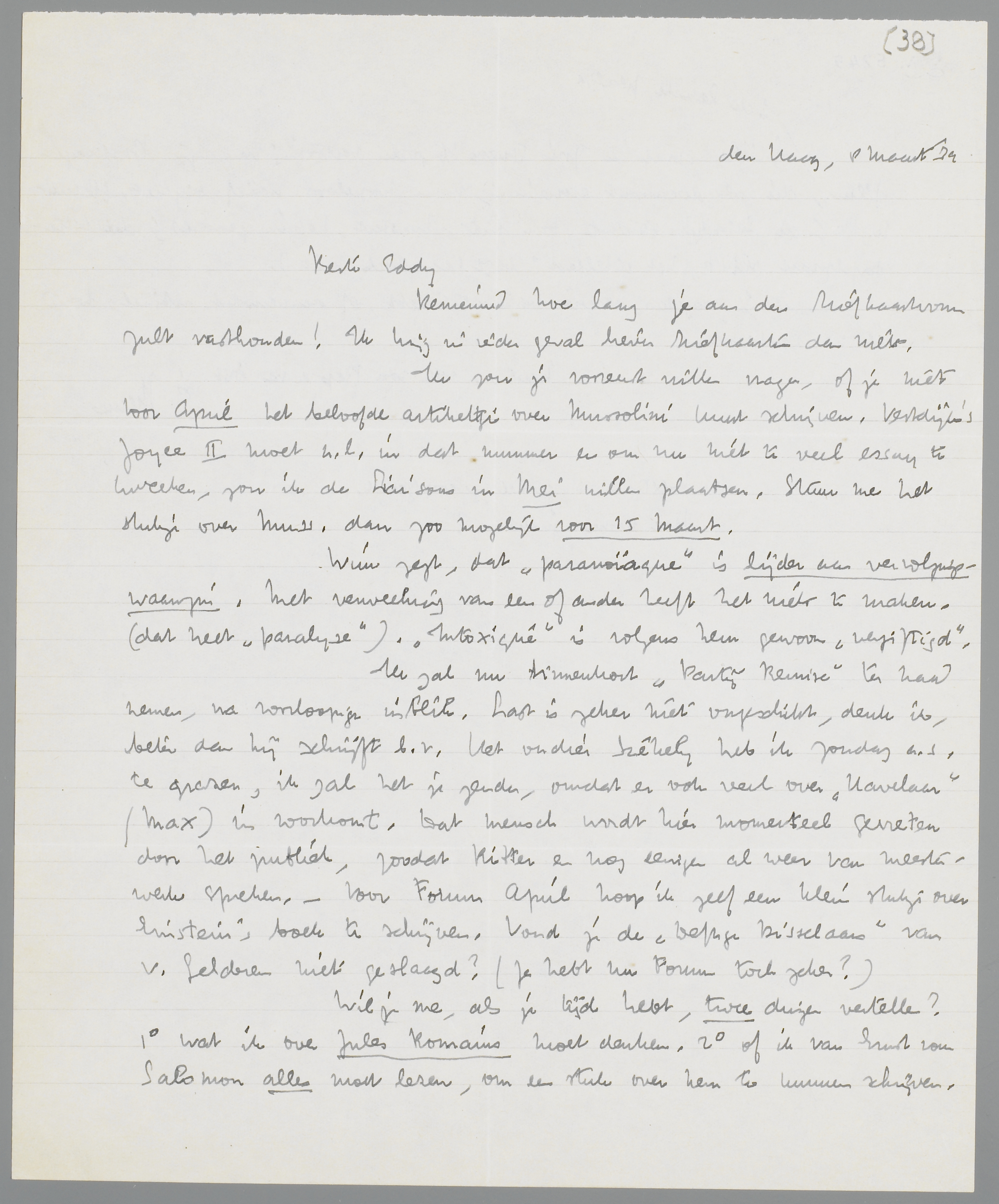 Benieuwd hoe lang je aan den briefkaartvorm zult vasthouden! Ik krijg in ieder geval liever briefkaarten dan niets. Ik zou je vooreerst willen vragen, of je niet voor April het beloofde artikeltje over Mussolini kunt schrijven. Vestdijk's Joyce II moet n.l. in dat nummer en om nu niet te veel essay te kweeken, zou ik de Liaisons in Mei willen plaatsen. Stuur me het stukje over Muss. dan zoo mogelijk voor 15 Maart.