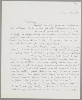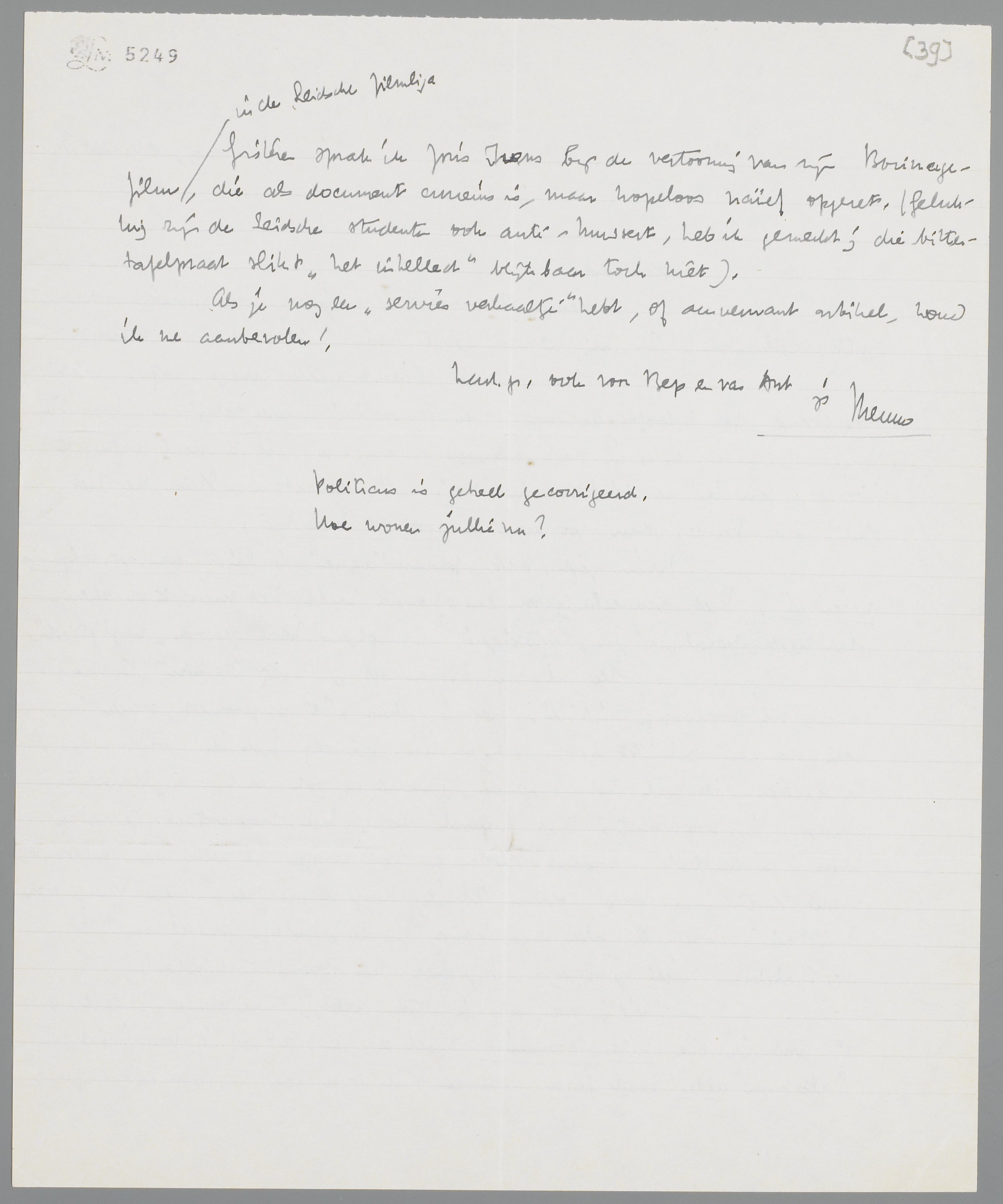 Wil je me, als je tijd hebt, twee dingen vertellen? 1o wat ik over Jules Romains moet denken. 2o of ik van Ernst von Salomon alles moet lezen, om een stuk over hem te kunnen schrijven. Gisteren sprak ik Joris Ivens bij de vertooning van zijn Borinagefilm in de Leidsche filmliga, die als document curieus is, maar hopeloos naïef opgezet. (Gelukkig zijn de Leidsche studenten ook anti-Mussert, heb ik gemerkt; die bittertafelpraat slikt ‘het intellect’ blijkbaar toch niet).