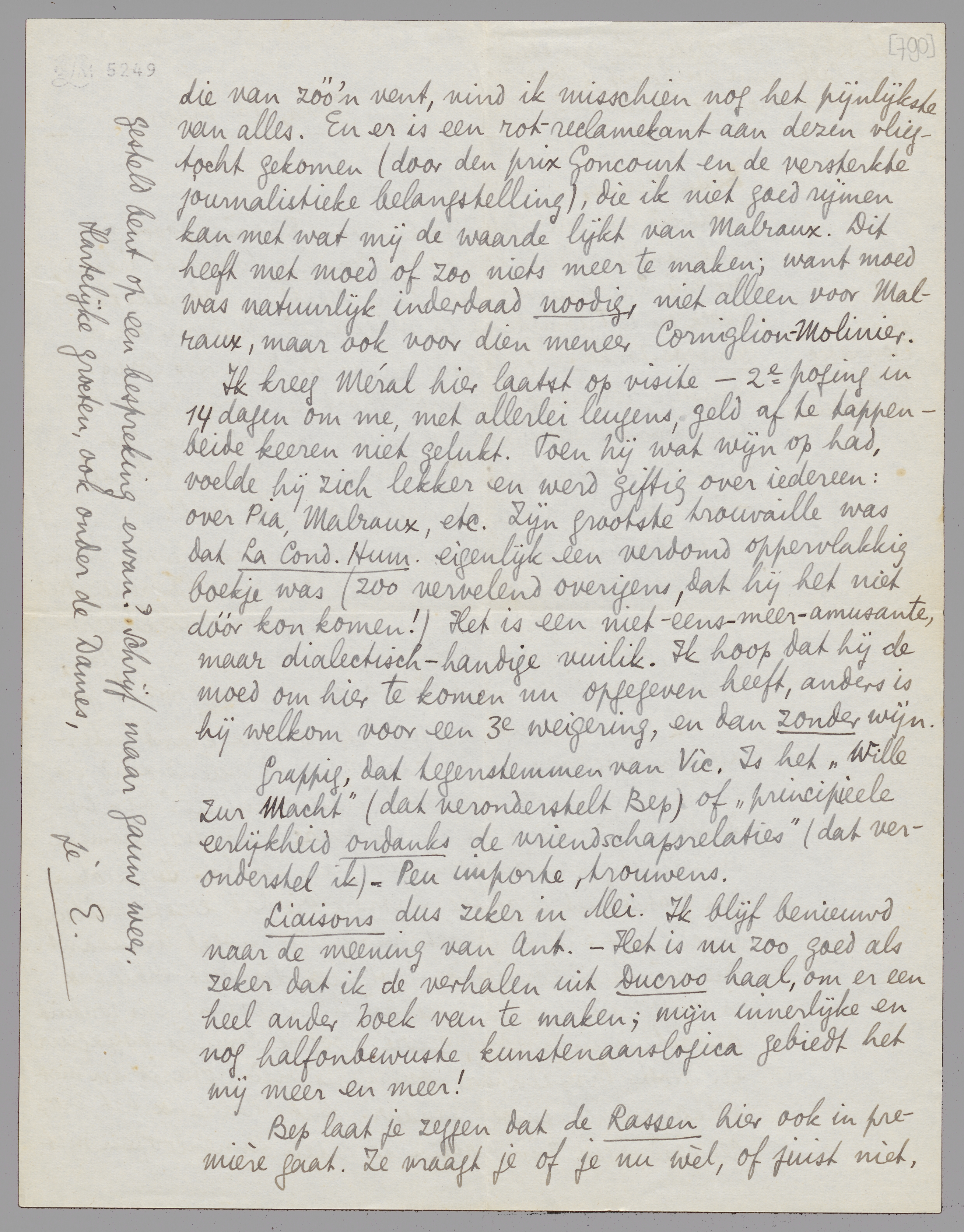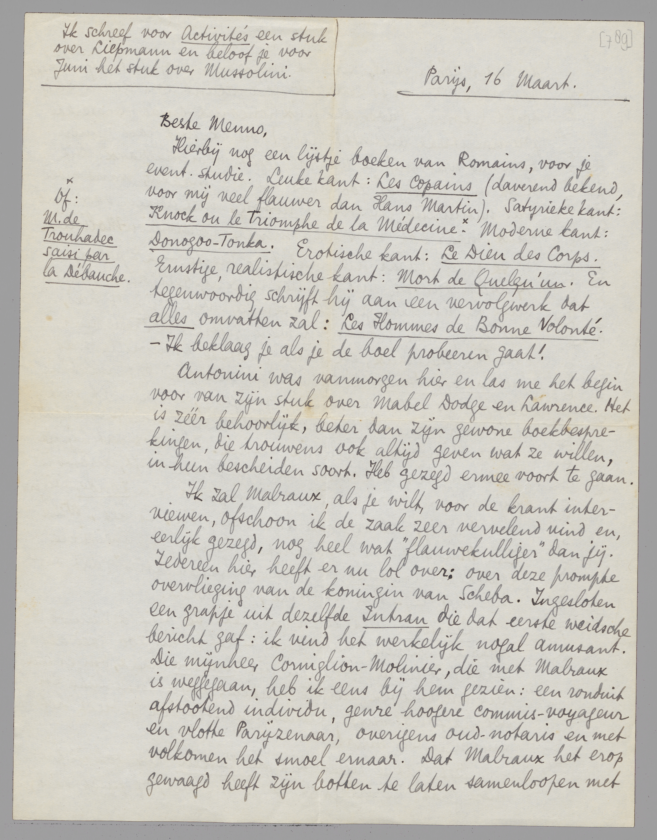 Ik zal Malraux, als je wilt, voor de krant interviewen, ofschoon ik de zaak zeer vervelend vind en, eerlijk gezegd, nog heel wat ‘flauwekulliger’ dan jij. Iedereen hier heeft er nu lol over: over deze prompte overvlieging van de koningin van Scheba. Ingesloten een grapje uit dezelfde Intran die dat eerste weidsche bericht gaf: ik vind het werkelijk nogal amusant. Die mijnheer Corniglion-Molinier, die met Malraux is weggegaan, heb ik eens bij hem gezien: een ronduit afstootend individu, genre hoogere commis-voyageur en vlotte Parijzenaar, overigens oud-notaris en met volkomen het smoel ernaar. Dat Malraux het erop gewaagd heeft zijn botten te laten samenloopen met die van zóó'n vent, vind ik misschien nog het pijnlijkste van alles. En er is een rot-reclamekant aan dezen vliegtocht gekomen (door den prix Goncourt en de versterkte journalistieke belangstelling), die ik niet goed rijmen kan met wat mij de waarde lijkt van Malraux. Dit heeft met moed of zoo niets meer te maken; want moed was natuurlijk inderdaad noodig, niet alleen voor Malraux, maar ook voor dien meneer Corniglion-Molinier.