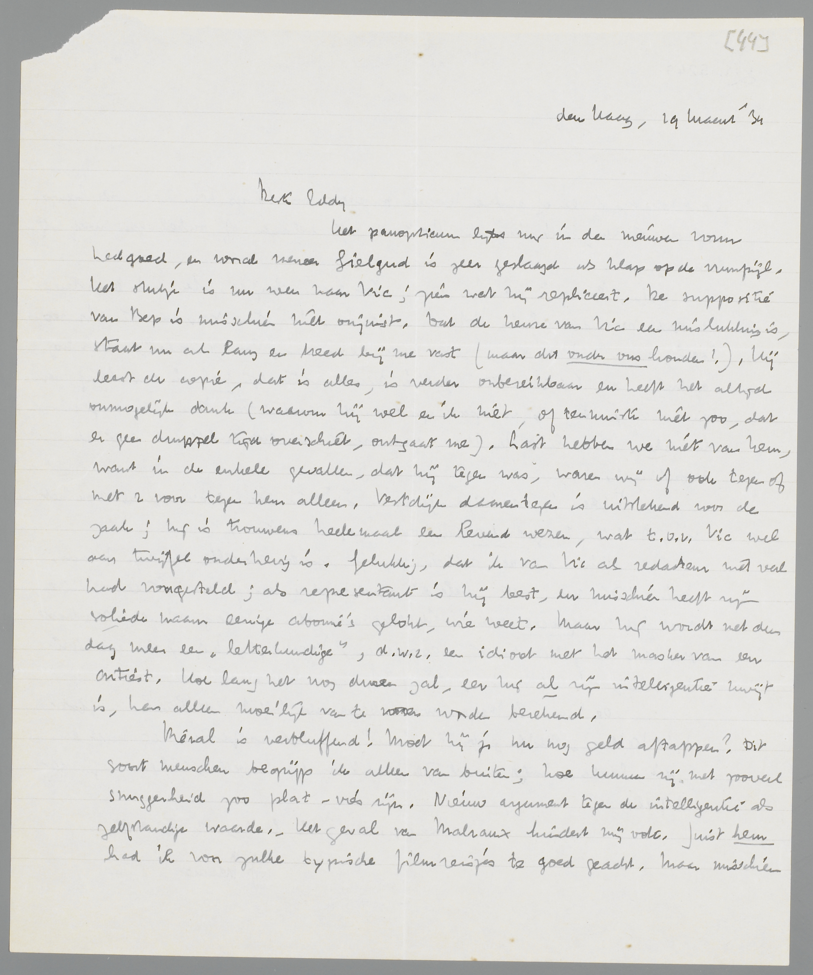 Het panopticum lijkt mij in den nieuwen vorm heel goed, en vooral meneer Gielgud is zeer geslaagd als klap op de vuurpijl. Het stukje is nu weer naar Vic; zien wat hij repliceert. De suppositie van Bep is misschien niet onjuist. Dat de keuze van Vic een mislukking is, staat nu al lang en breed bij me vast (maar dit onder ons houden!). Hij leest de copie, dat is alles, is verder onbereikbaar en heeft het altijd onmogelijk druk (waarom hij wel en ik niet, of tenminste niet zoo, dat er geen druppel tijd overschiet, ontgaat me). Last hebben we niet van hem, want in de enkele gevallen, dat hij tegen was, waren wij of ook tegen of met 2 voor tegen hem alleen. Vestdijk daarentegen is uitstekend voor de zaak; hij is trouwens heelemaal een levend wezen, wat t.o.v. Vic wel aan twijfel onderhevig is. Gelukkig, dat ik van Vic als redacteur niet veel had voorgesteld; als representant is hij best, en misschien heeft zijn soliede naam eenige abonné's gelokt, wie weet. Maar hij wordt met den dag meer een ‘letterkundige’, d.w.z. een idioot met het masker van een artiest. Hoe lang het nog duren zal, eer hij al zijn intelligentie kwijt is, kan alleen moeilijk van te voren worden berekend.
