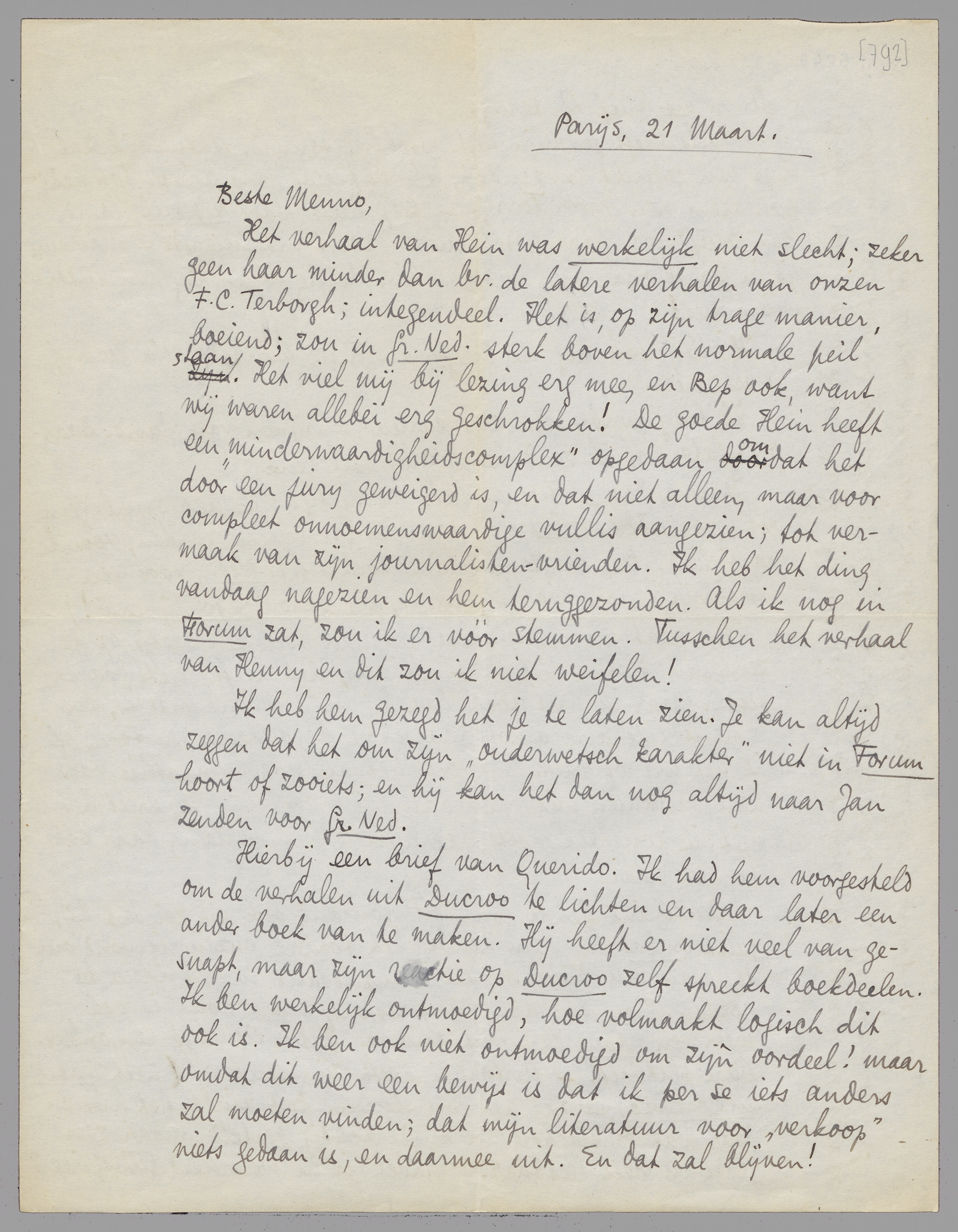 Ik heb hem gezegd het je te laten zien. Je kan altijd zeggen dat het om zijn ‘ouderwetsch karakter’ niet in Forum hoort of zooiets; en hij kan het dan nog altijd naar Jan zenden voor Gr. Ned. Hierbij een brief van Querido. Ik had hem voorgesteld om de verhalen uit Ducroo te lichten en daar later een ander boek van te maken. Hij heeft er niet veel van gesnapt, maar zijn reactie op Ducroo zelf spreekt boekdeelen. Ik ben werkelijk ontmoedigd, hoe volmaakt logisch dit ook is. Ik ben ook niet ontmoedigd om zijn oordeel! maar omdat dit weer een bewijs is dat ik per se iets anders zal moeten vinden; dat mijn literatuur voor ‘verkoop’ niets gedaan is, en daarmee uit. En dat zal blijven!