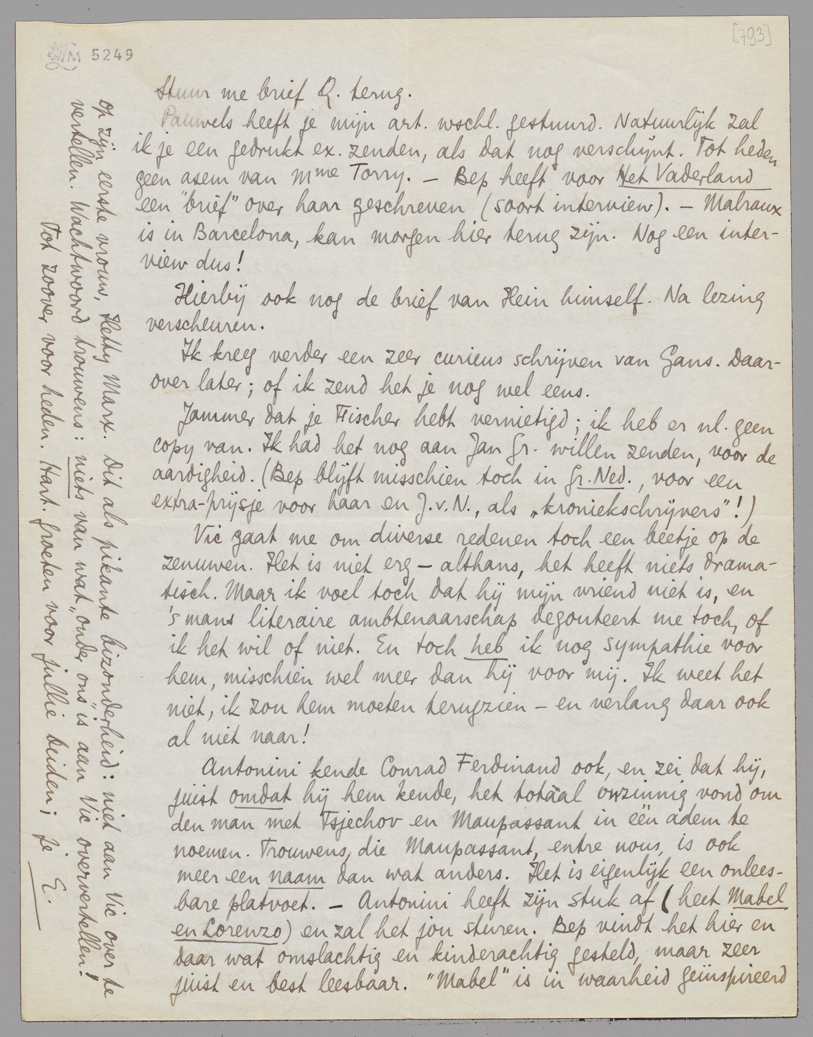 Pauwels heeft je mijn art. wschl. gestuurd. Natuurlijk zal ik je een gedrukt ex. zenden, als dat nog verschijnt. Tot heden geen asem van Mme Torry. - Bep heeft voor Het Vaderland een ‘brief’ over haar geschreven (soort interview). - Malraux is in Barcelona, kan morgen hier terug zijn. Nog een interview dus!