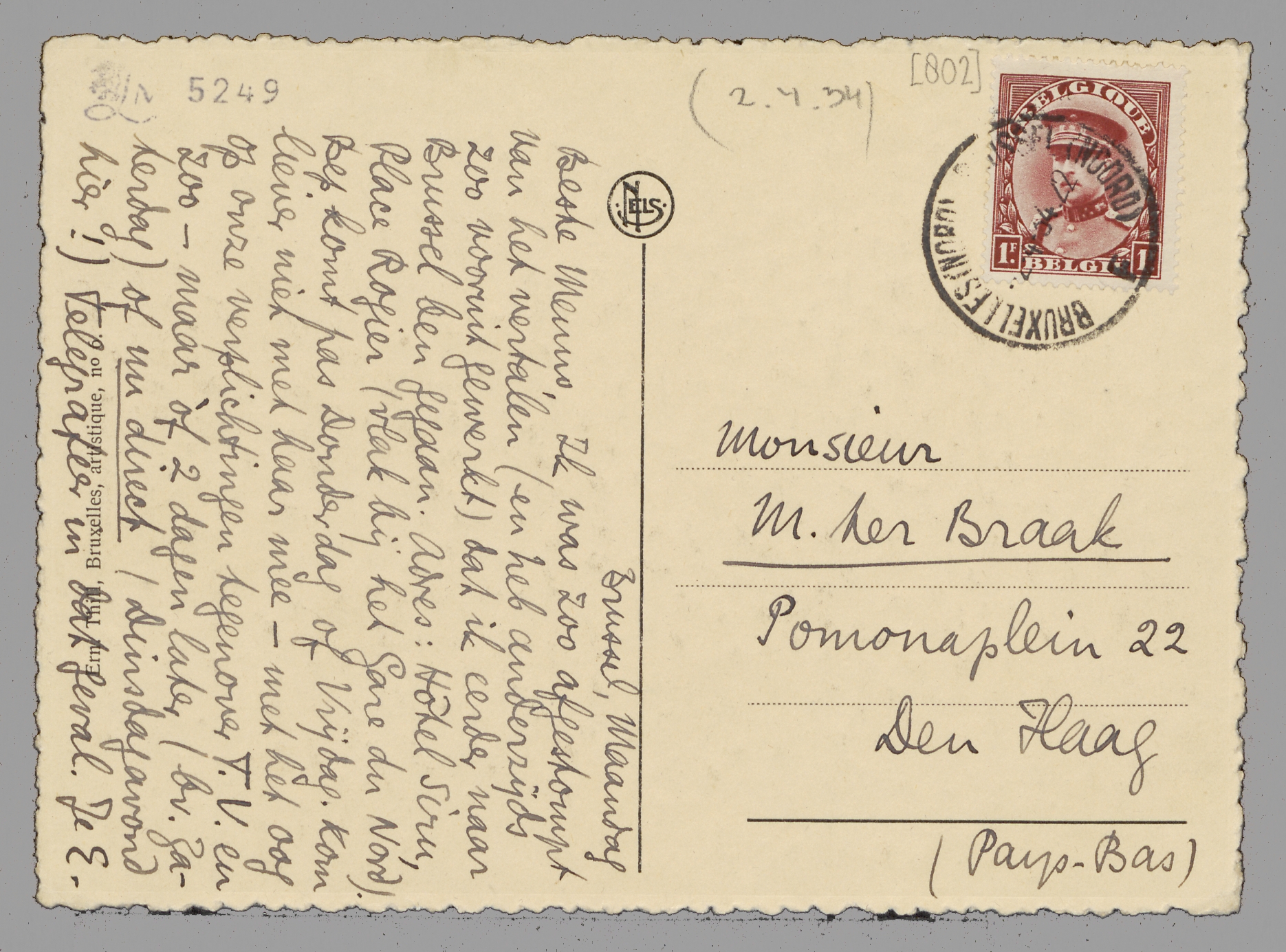 Ik was zoo afgestompt van het vertalen (en heb anderzijds zoo vooruit gewerkt) dat ik eerder naar Brussel ben gegaan. Adres: Hôtel Siru, Place Rogier (vlak bij het Gare du Nord). Bep komt pas Donderdag of Vrijdag. Kom liever niet met haar mee - met het oog op onze verplichtingen tegenover T. V. en zoo - maar òf 2 dagen later (bv. Zaterdag) of nu direct (Dinsdagavond hier!) Telegrafeer in dat geval.