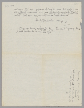 Daarnet je briefkaart. Je kunt natuurlijk Vrijdag om 1.30 aankomen en bv. een kamer nemen in ditzelfde hotel. Keurige eenheidsprijzen-bedoening, 25 frs. per kamer met eigen poepdoos en waschgelegenheid! Maar... 's middags om half 5 moeten wij naar het hospitaal waar Annie v. Schendel is, daarna gaan wij den heelen avond onze ‘menschelijke schuld’ aan de Timmersen afdoen. Zaterdagmorgen zijn we vrij. Als we Annie tot Zaterdag uitstellen, zijn we samen van ± 2 tot 5; vind je dat de moeite waard? En voor ons maakt het dan iets anders onmogelijk, bv. om op hetzelfde uur iets af te doen met Maasland. Maar het kan. Als je Vrijdagmorgen kon komen, hadden we er meer aan, maar toch niet veel... Het blijft een treurige onderneming, vind ik. En Donderdag zijn we ook al bezet. [Tante de Sturler of Hellens, ik denk de eerste!]