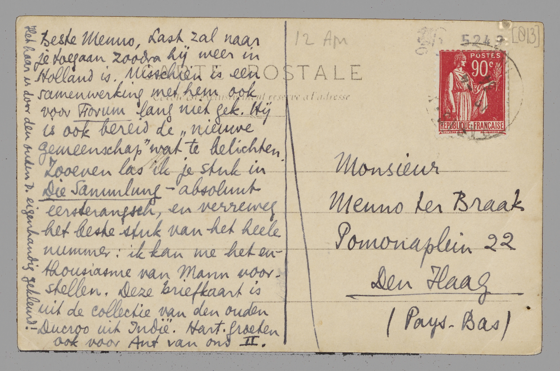 Last zal naar je toegaan zoodra hij weer in Holland is. Misschien is een samenwerking met hem ook voor Forum lang niet gek. Hij is ook bereid de ‘nieuwe gemeenschap’ wat te belichten. Zooeven las ik je stuk in Die Sammlung - absoluut eersterangsch, en verreweg het beste stuk van het heele nummer: ik kan me het enthousiasme van Mann voorstellen. Deze briefkaart is uit de collectie van den ouden Ducroo uit Indië. Hart. groeten ook voor Ant van ons II.