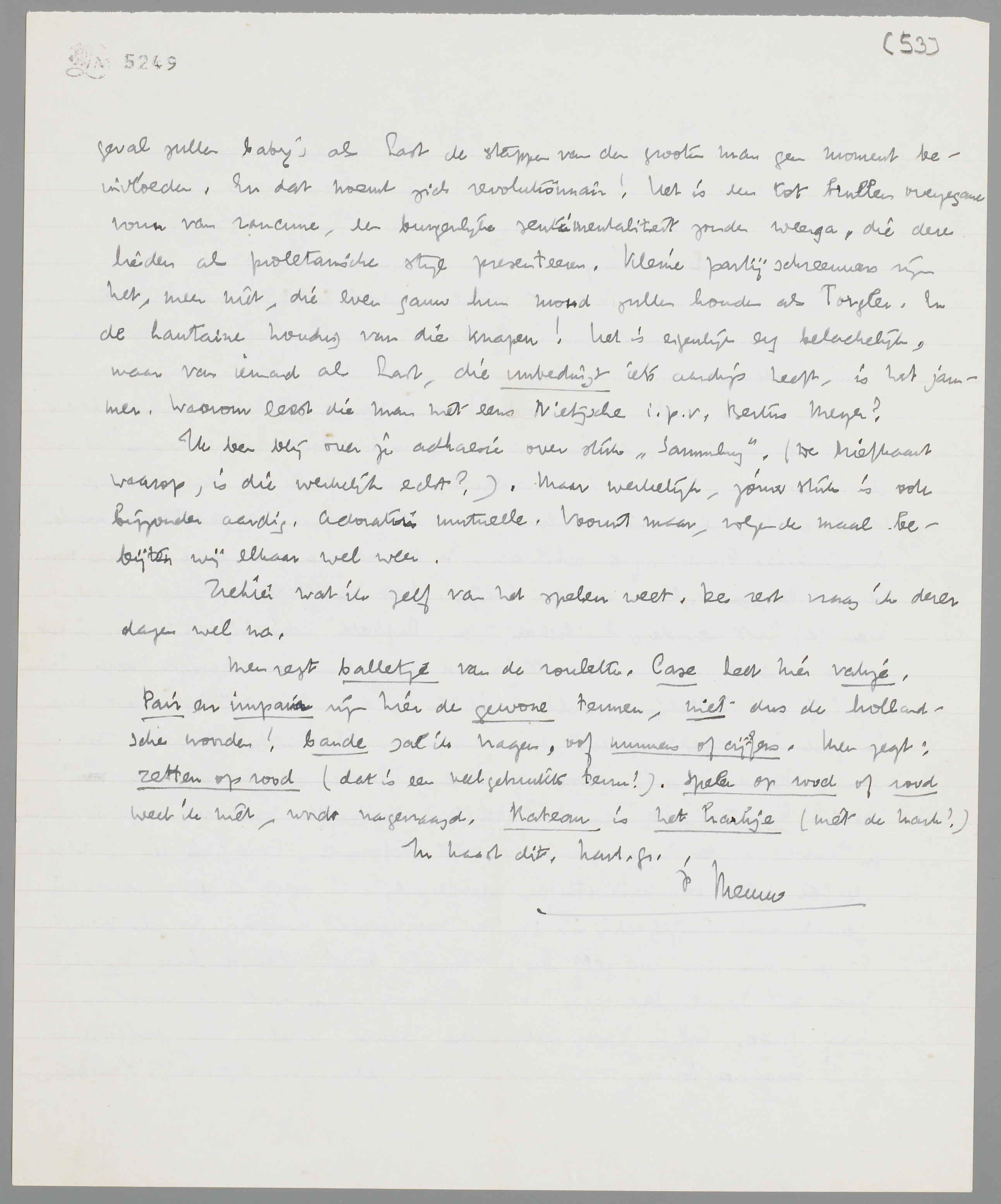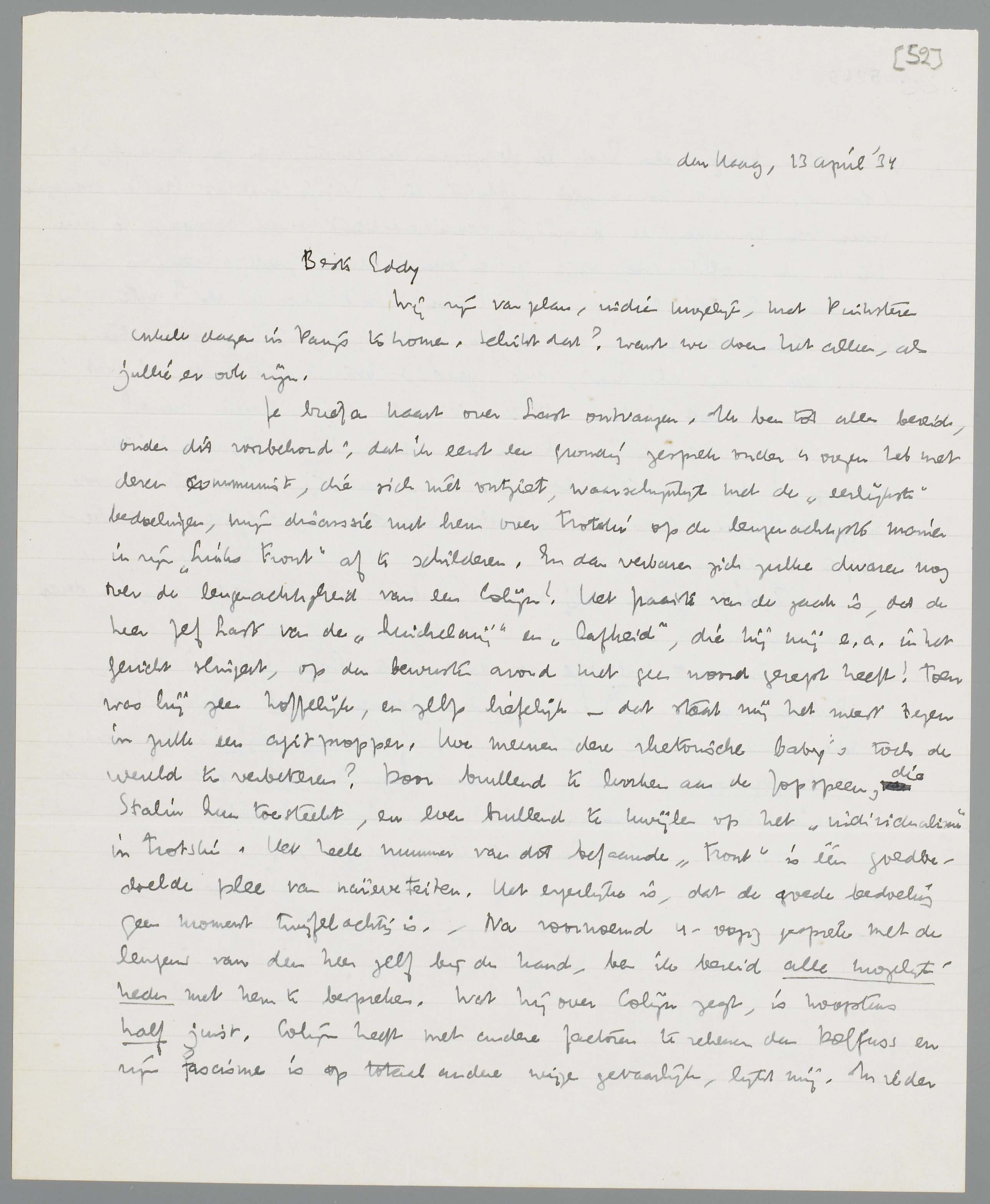 Je brief en kaart over Last ontvangen. Ik ben tot alles bereid, onder dit voorbehoud: dat ik eerst een grondig gesprek onder 4 oogen heb met dezen communist, die zich niet ontziet, waarschijnlijk met de ‘eerlijkste’ bedoelingen, mijn discussie met hem over Trotski op de leugenachtigste manier in zijn Links Front af te schilderen. En dan verbazen zich zulke dwazen nog over de leugenachtigheid van een Colijn! Het fraaiste van de zaak is, dat de heer Jef Last van de ‘huichelarij’ en ‘lafheid’, die hij mij e.a. in het gezicht slingert, op den bewusten avond met geen woord gerept heeft! Toen was hij zeer hoffelijk, en zelfs liefelijk - dat staat mij het meest tegen in zulk een agitpropper. Hoe meenen deze rhetorische baby's toch de wereld te verbeteren? Door brullend te lurken aan de fopspeen, die Stalin hun toesteekt, en even brullend te kwijlen op het ‘individualisme’ in Trotski. Het heele nummer van dit befaamde Front is één goedbedoelde plee van naïeveteiten. Het ergerlijke is, dat de goede bedoeling geen moment twijfelachtig is. - Na voornoemd 4-oogig gesprek met de leugens van den heer zelf bij de hand, ben ik bereid alle mogelijkheden met hem te bespreken. Wat hij over Colijn zegt, is hoogstens half juist. Colijn heeft met andere factoren te rekenen dan Dolfuss en zijn fascisme is op totaal andere wijze gevaarlijk, lijkt mij. In ieder geval zullen baby's als Last de stappen van den grooten man geen moment beïnvloeden. En dat noemt zich revolutionnair! Het is een tot brullen overgegane vorm van rancune, een burgerlijke sentimentaliteit zonder weerga, die deze lieden als proletarische stijl presenteeren. Kleine partijschreeuwers zijn het, meer niet, die even gauw hun mond zullen houden als Torgler. En de hautaine houding van die knapen! Het is eigenlijk erg belachelijk, maar van iemand als Last, die unbedingt iets aardigs heeft, is het jammer. Waarom leest die man niet eens Nietzsche i.p.v. Bertus Meyer?