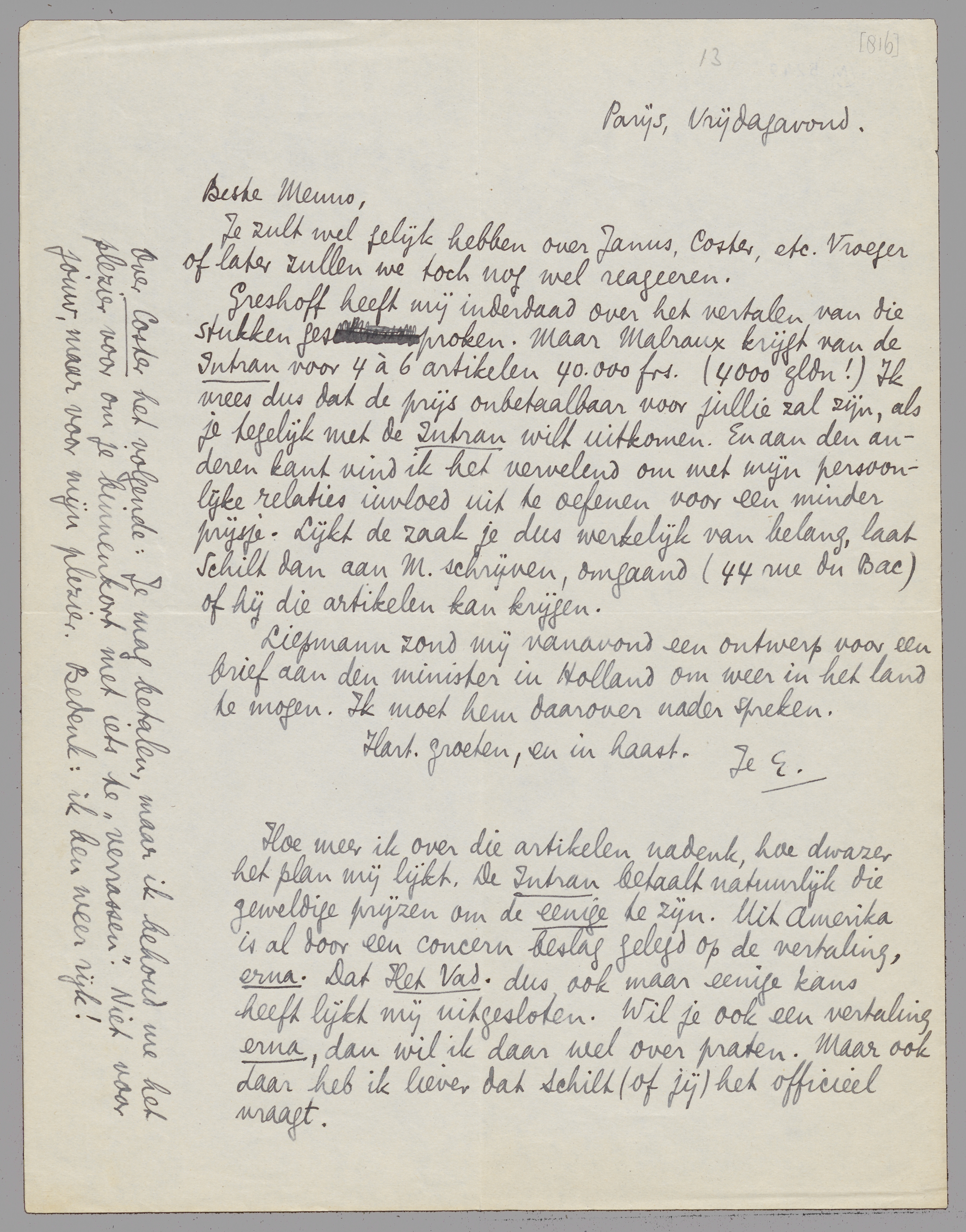 Greshoff heeft mij inderdaad over het vertalen van die stukken gesproken. Maar Malraux krijgt van de Intran voor 4 à 6 artikelen 40.000 frs. (4000 gldn!) Ik vrees dus dat de prijs onbetaalbaar voor jullie zal zijn, als je tegelijk met de Intran wilt uitkomen. En aan den anderen kant vind ik het vervelend om met mijn persoonlijke relaties invloed uit te oefenen voor een minder prijsje. Lijkt de zaak je dus werkelijk van belang, laat Schilt dan aan M. schrijven, omgaand (44 rue du Bac) of hij die artikelen kan krijgen.